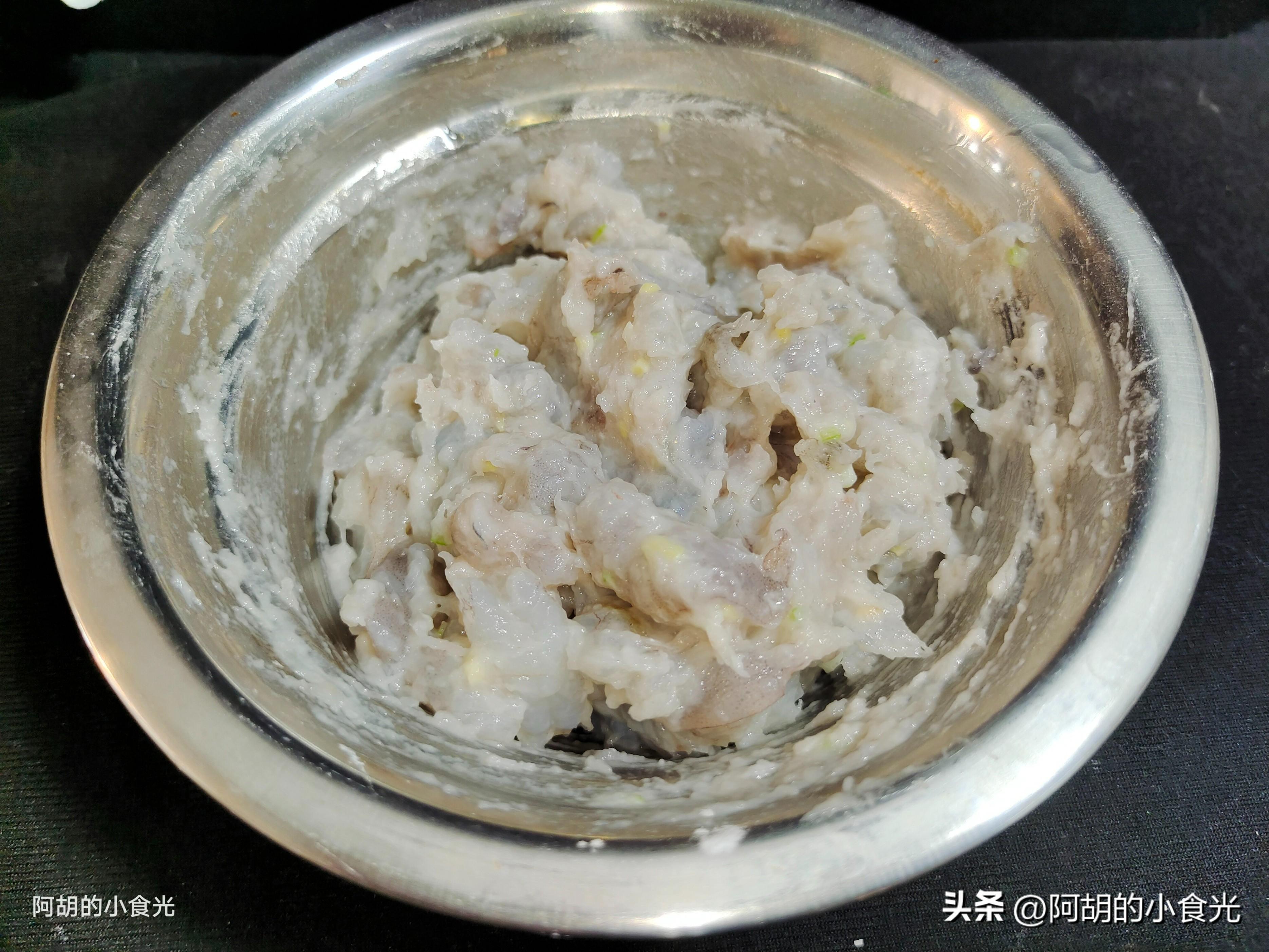 第二步:今天所用的蝦滑就是平時喫火鍋時所用的袋裝蝦滑,有條件的也可以購買活蝦剔出蝦肉後剁碎製作。將蝦滑擠出後加入一些蔥薑末、食鹽和幹澱粉攪拌均勻備用。
