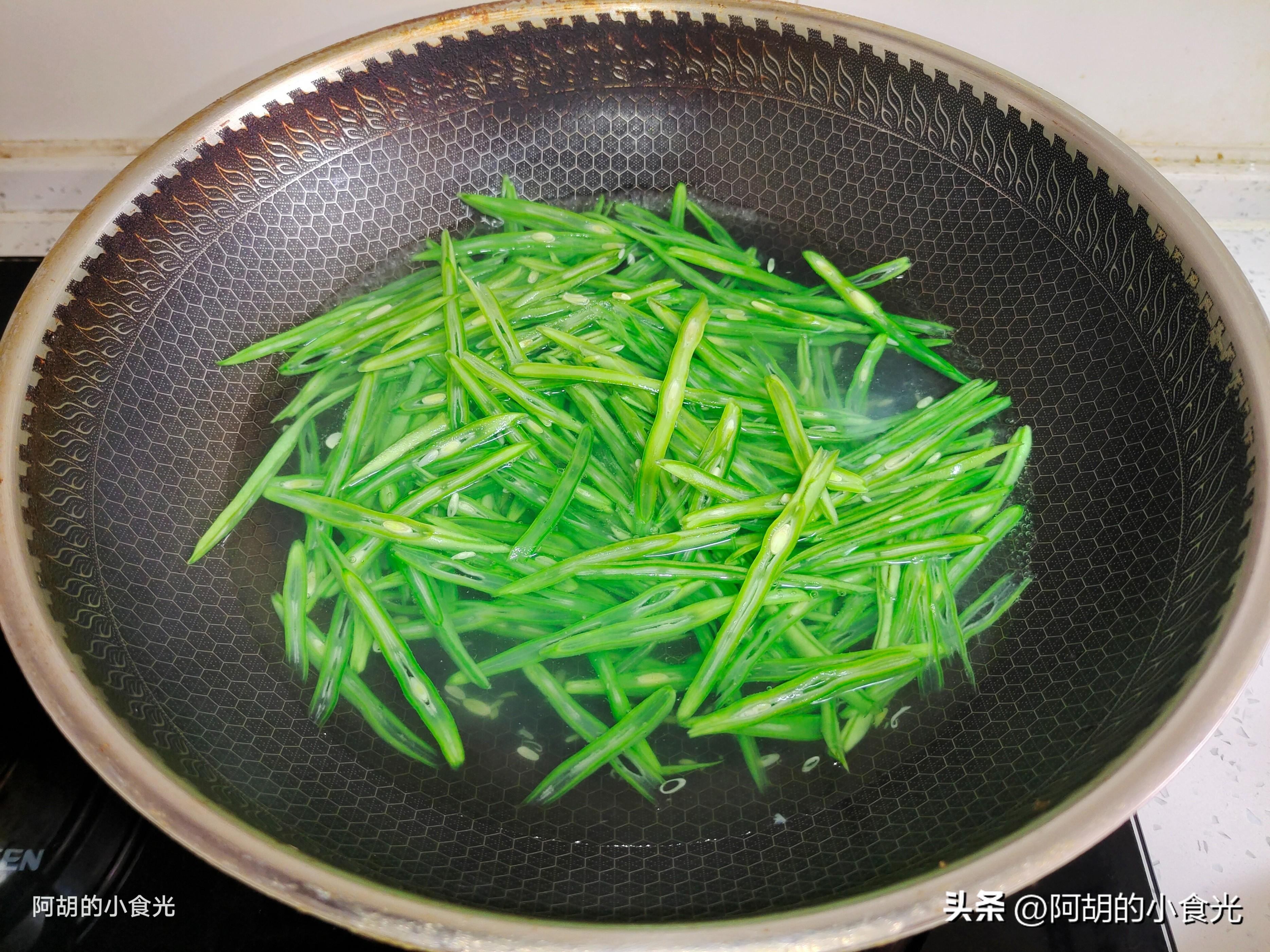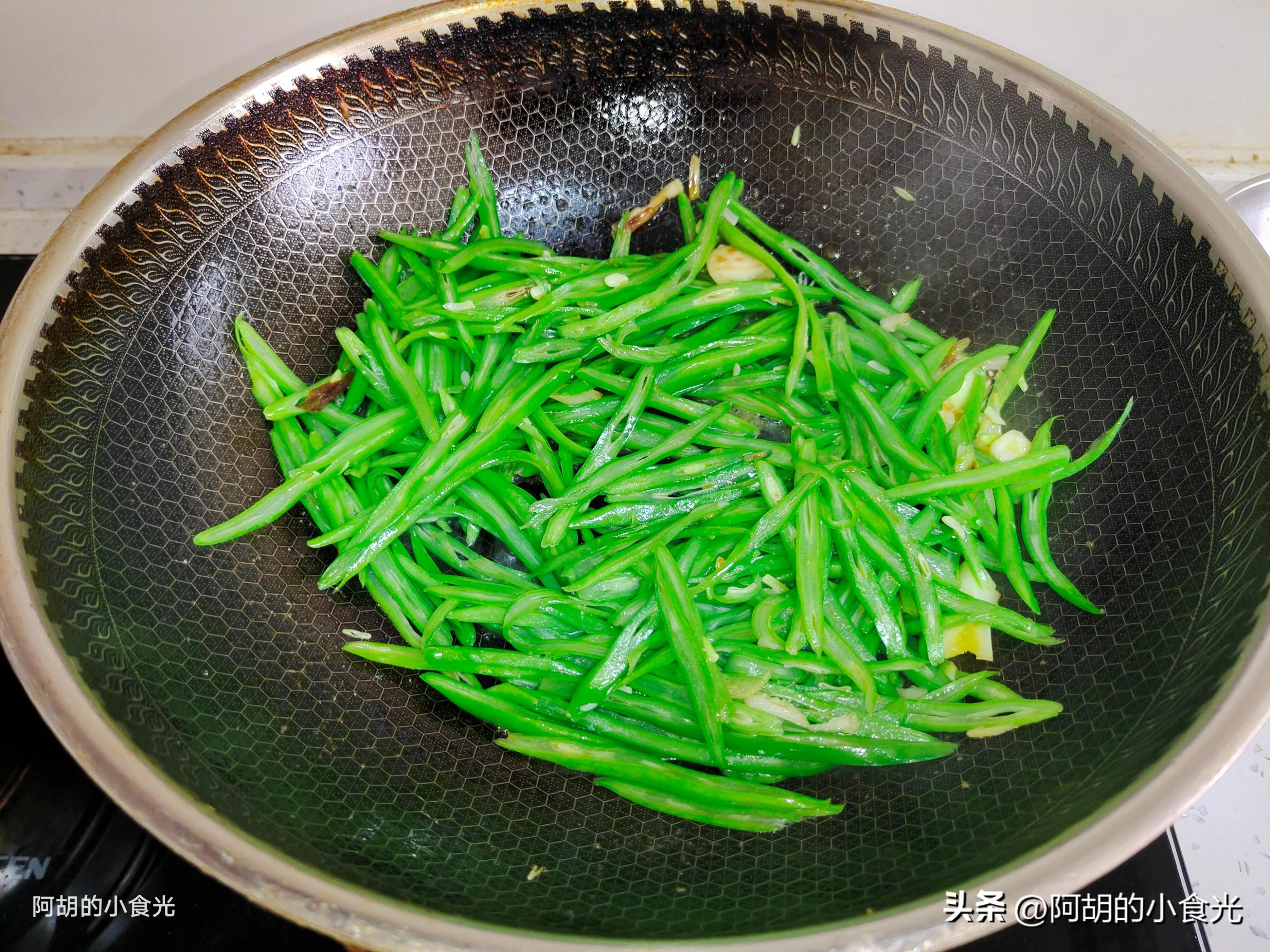 第四步:所有食材準備完畢後就可以開火烹飪了。鍋燒熱後淋入一些菜籽油,燒熱後倒入一些蔥蒜末炒出香味,接着將焯水後的豆角絲倒入鍋中,淋入一些蠔油,轉爲大火翻炒十幾秒鐘,炒去一些水分後激發出食材的香味。