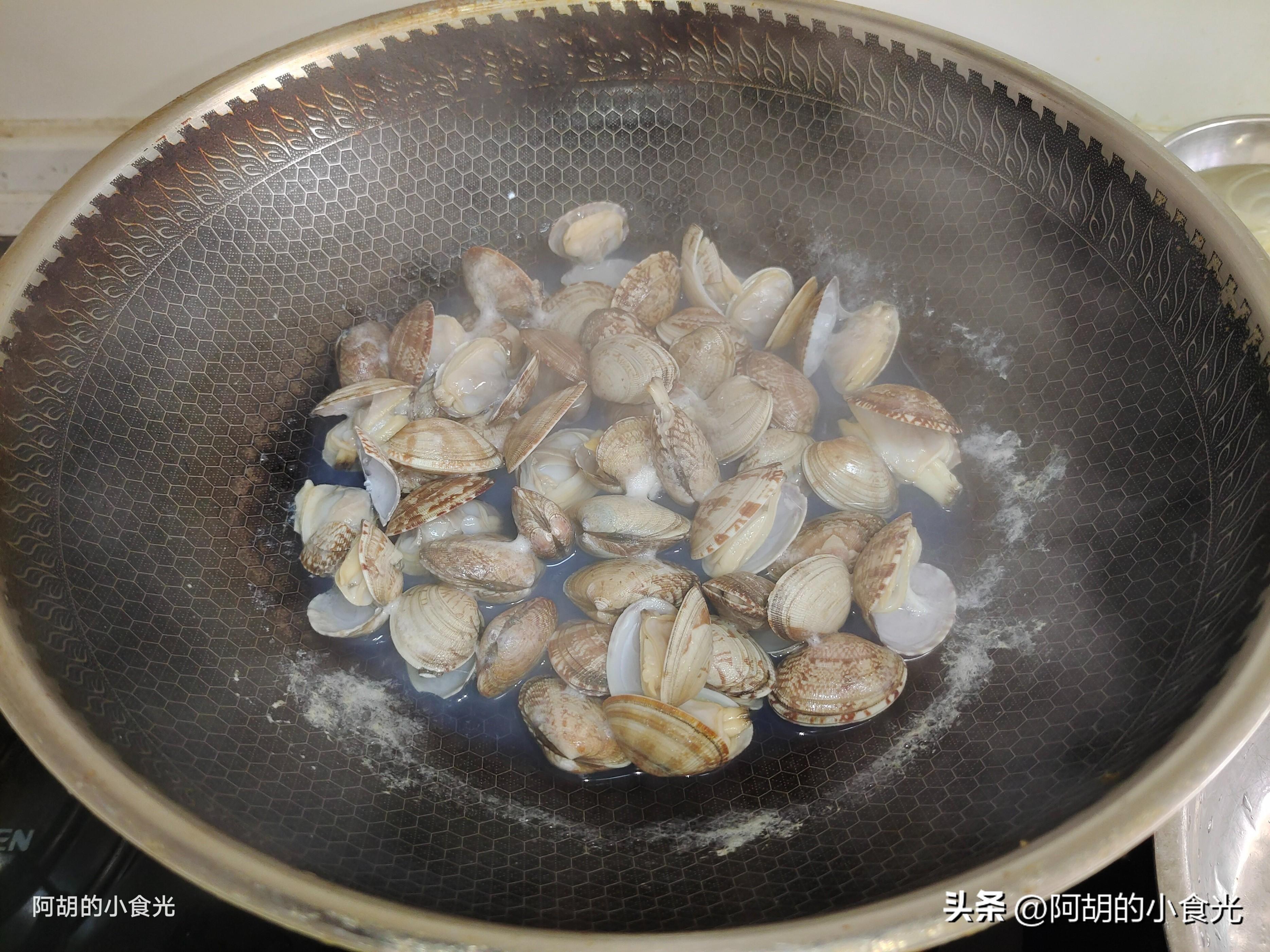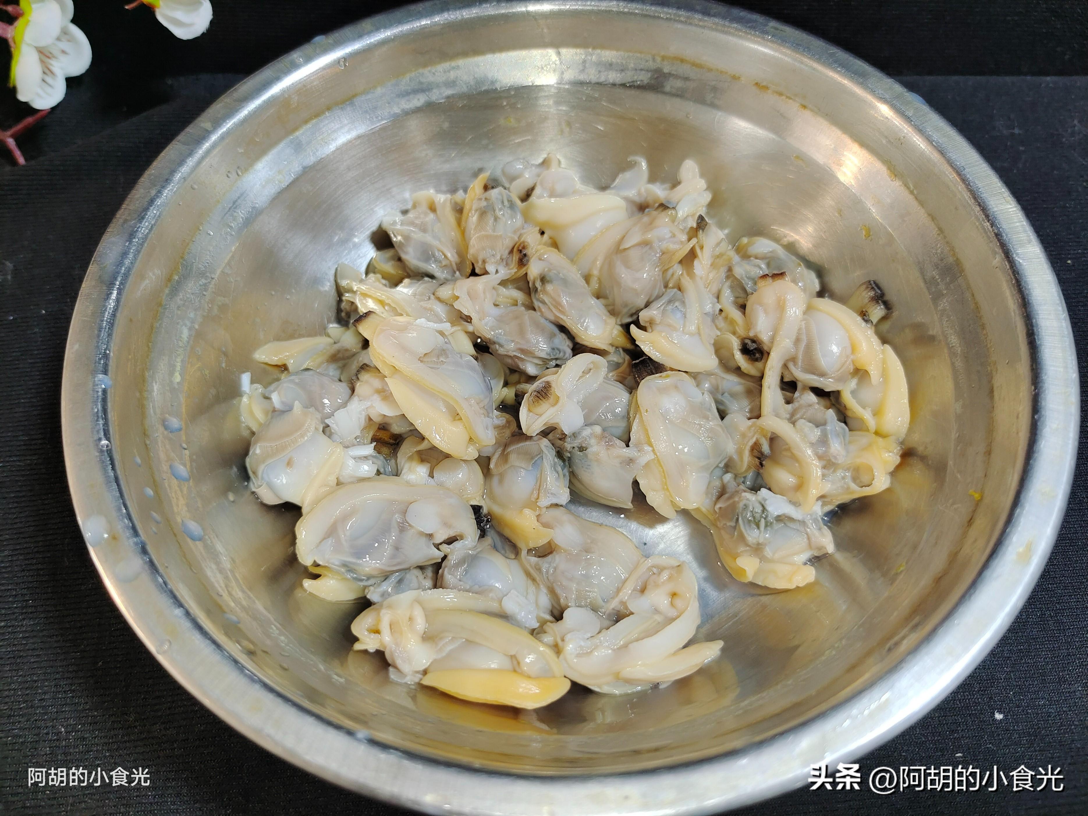第三步:挑選一些鮮活的花蛤,買回家後最好先用淡鹽水浸泡一個小時左右,讓其吐一吐體內的一些泥沙雜質,然後再搓洗乾淨外殼表面。撈出後倒入鍋中,添入一碗涼水開大火煮開至全部開殼。撈出後漿所有花蛤肉挑出備用,剩下的花蛤原湯倒入碗中靜置沉澱一下備用。