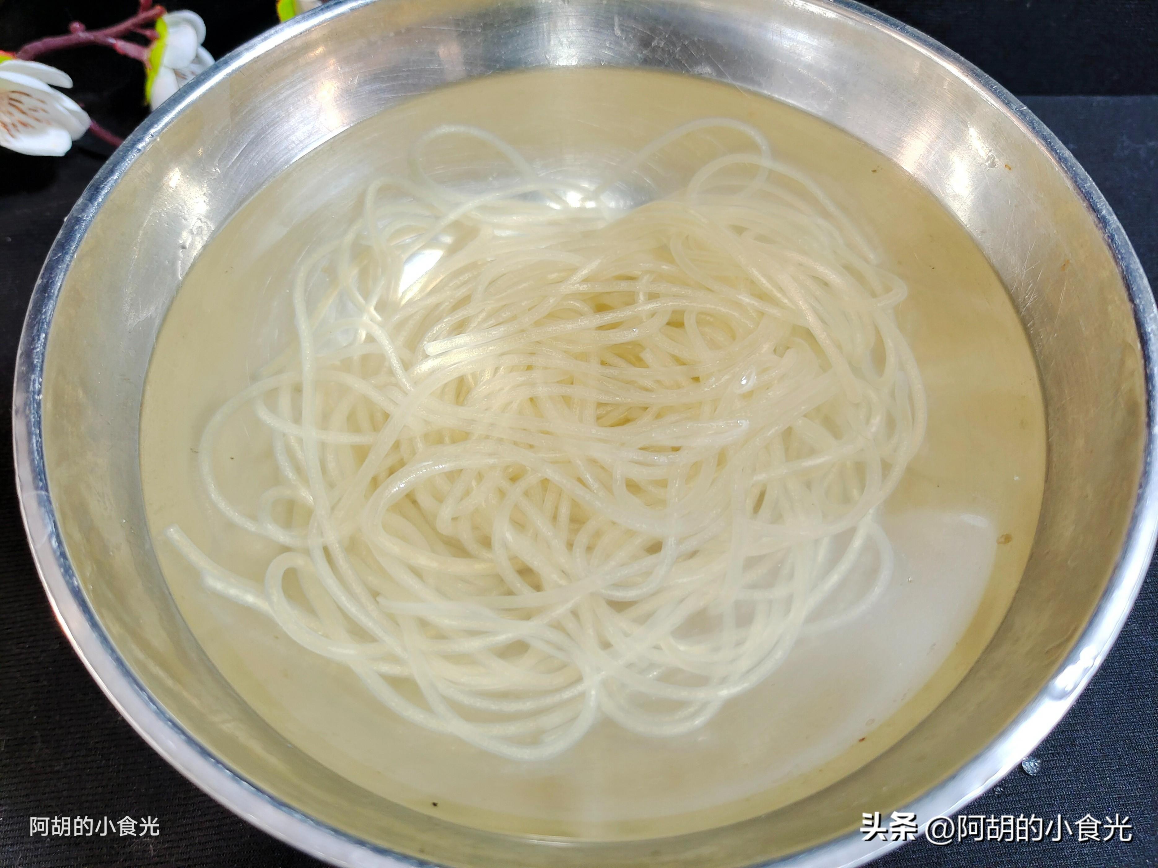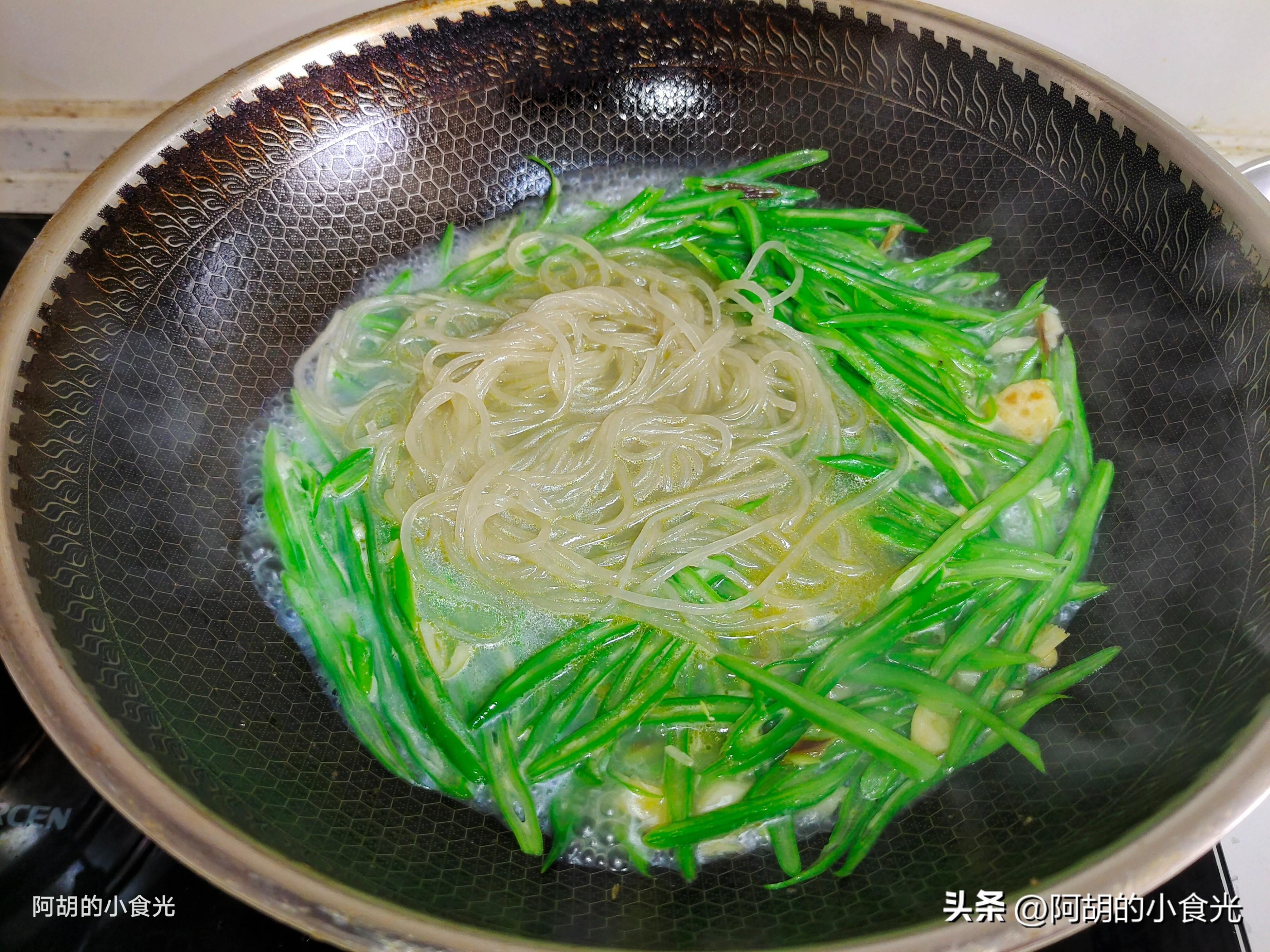 第二步:鍋裏燒一些開水,滴入幾滴食用油,而後把豆角絲倒入鍋中焯燙一分鐘,撈出後瀝乾水分備用。再將一小把乾粉條放入開水中煮軟,撈出後浸入涼水中等待使用。