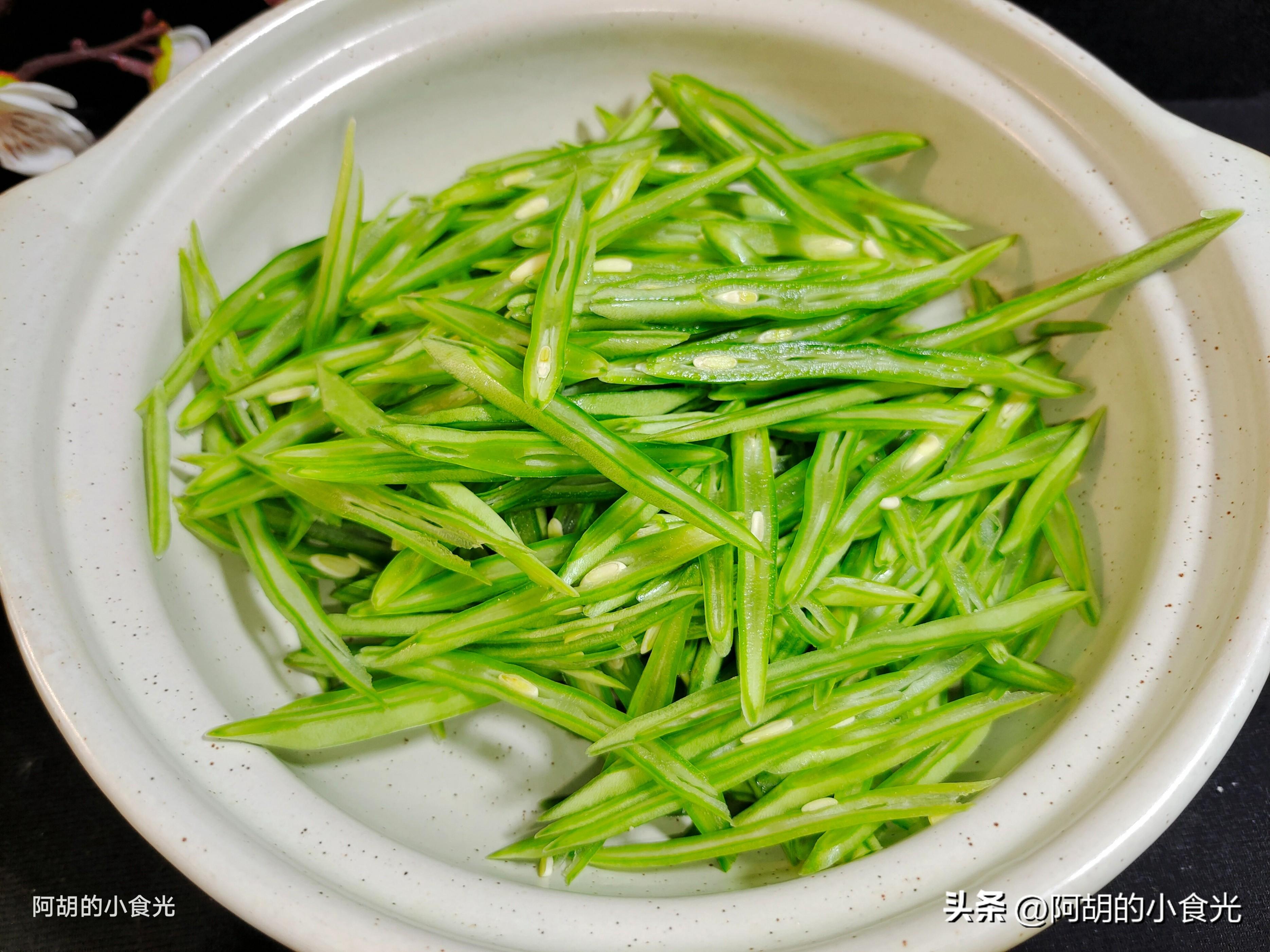 第一步:先來準備一把鮮嫩的扁豆角,用流水沖洗乾淨後切成絲放入盆中備用。扁豆角的種類很多,一般都可以拿來製作此菜,記住一定要將其切絲哦。
