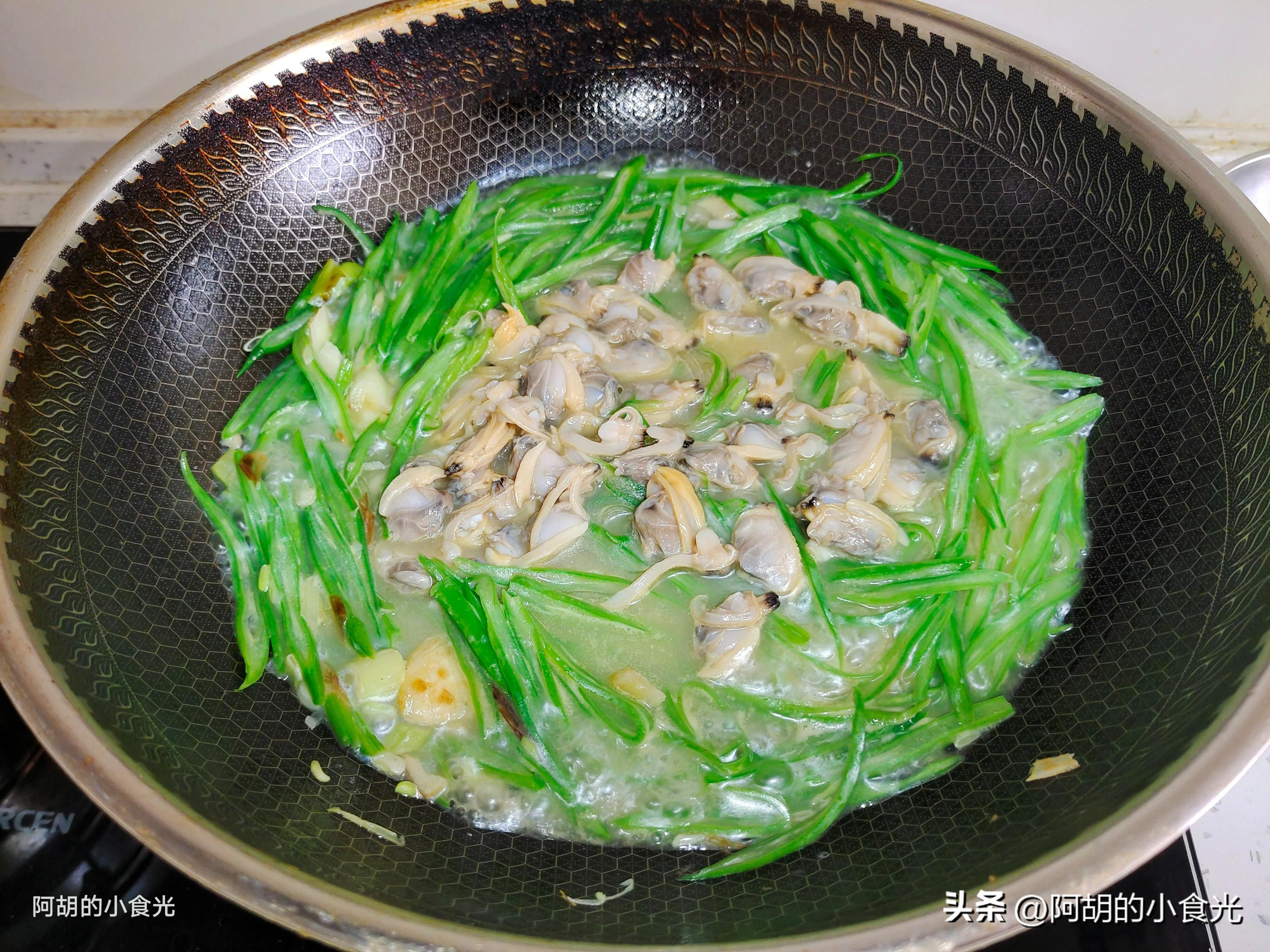 第六步:取出花蛤肉直接倒入鍋中,略微翻拌一下,保持大火再煮個一分鐘左右就可以出鍋裝盤了。一道很是清爽,湯鮮菜嫩的下飯好菜,想要夏天有好菜的不妨動手試做一下,好喫好做全家都愛。