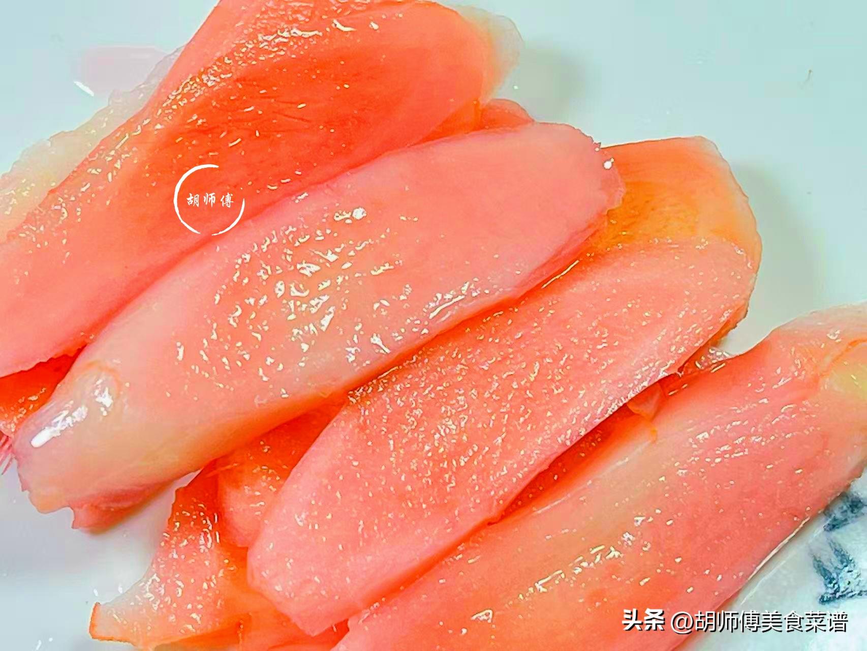 第三步:把洗淨的仔姜放入砧板上,然後將仔姜切成0.3釐米厚的薄片,接着將5克食鹽全部撒到仔姜中攪拌均勻,最後將仔姜醃製1小時即可。千萬不要久醃,因爲仔姜比較嫩,醃的太久,仔姜口感就不會很好。