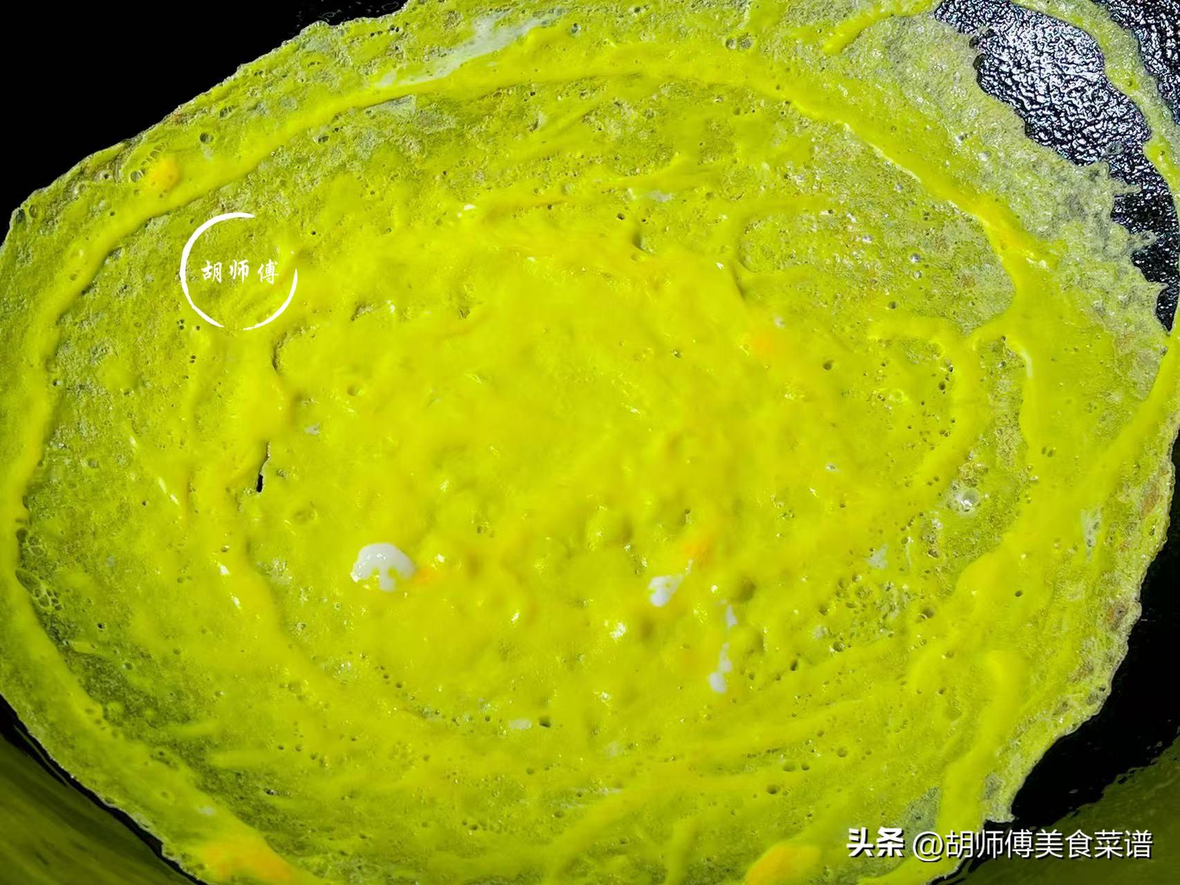 第三步:鍋中放入適量油,等油燒熱後,把油倒出來,然後將雞蛋液放入鍋中,接着慢慢搖晃鍋,等雞蛋皮完全凝固後就可以拿出來,最後再把雞蛋皮切成細絲備用。