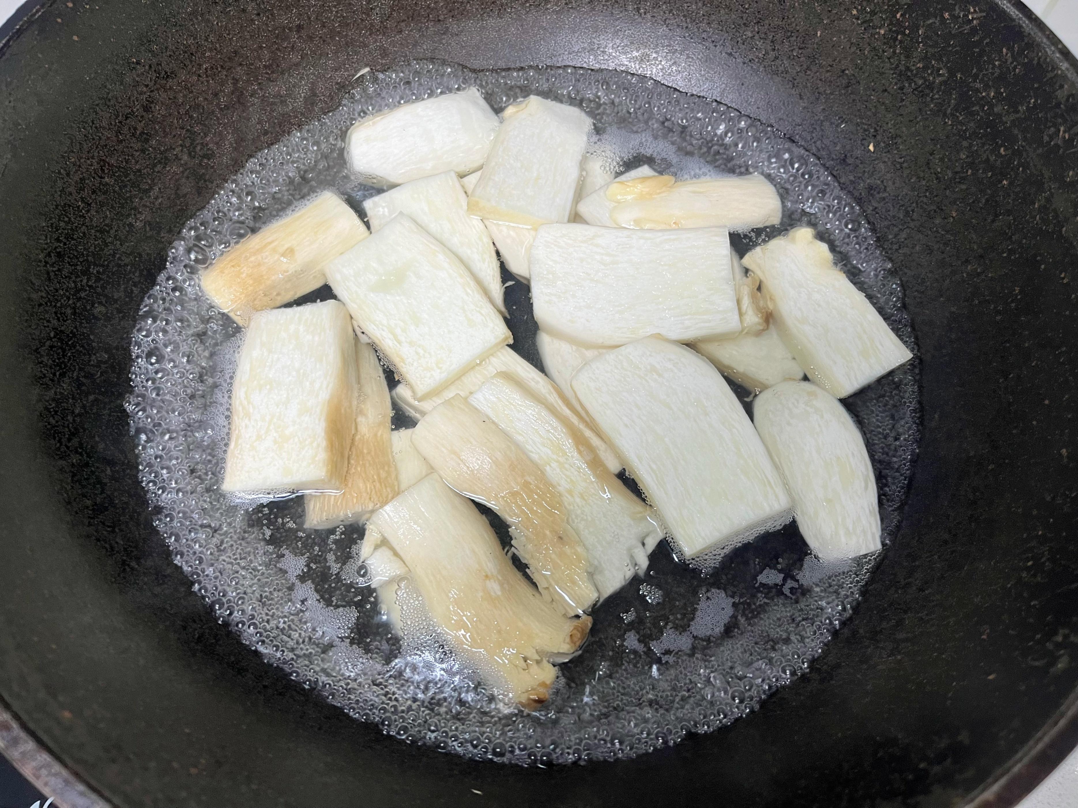 - 杏鮑菇洗淨後直接焯水3分鐘(時間別太長,煮軟了沒嚼勁)。