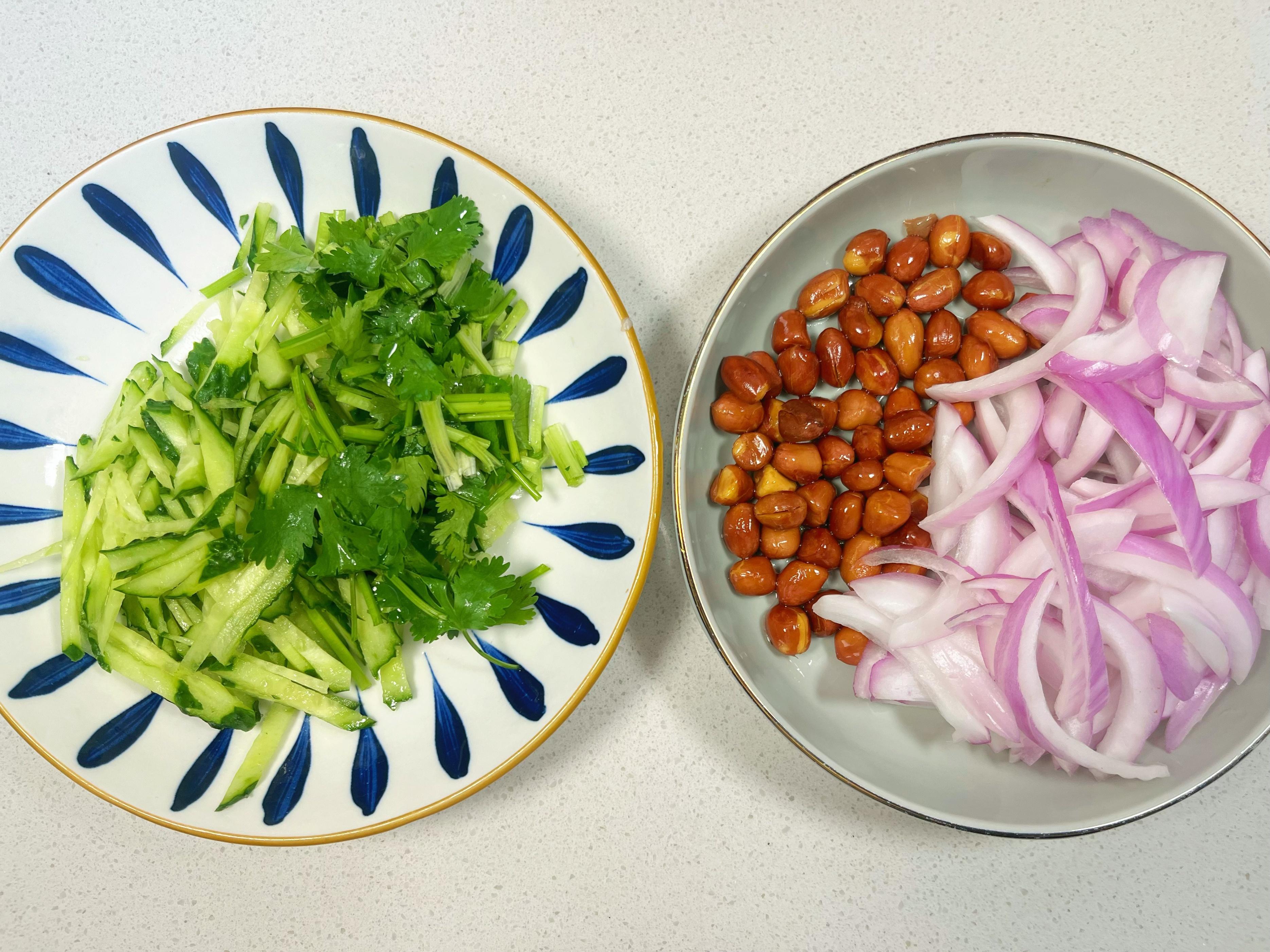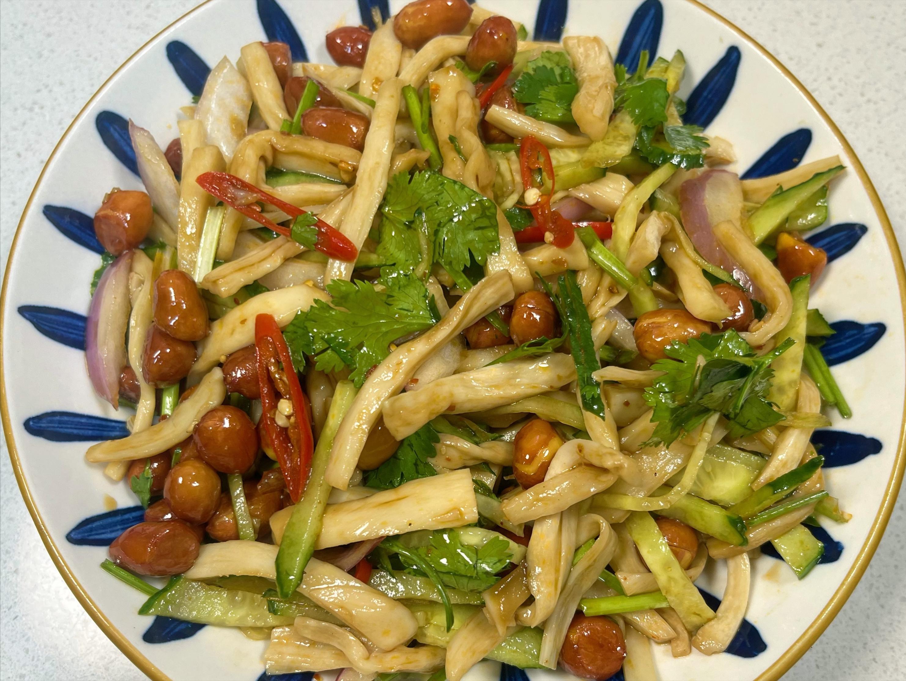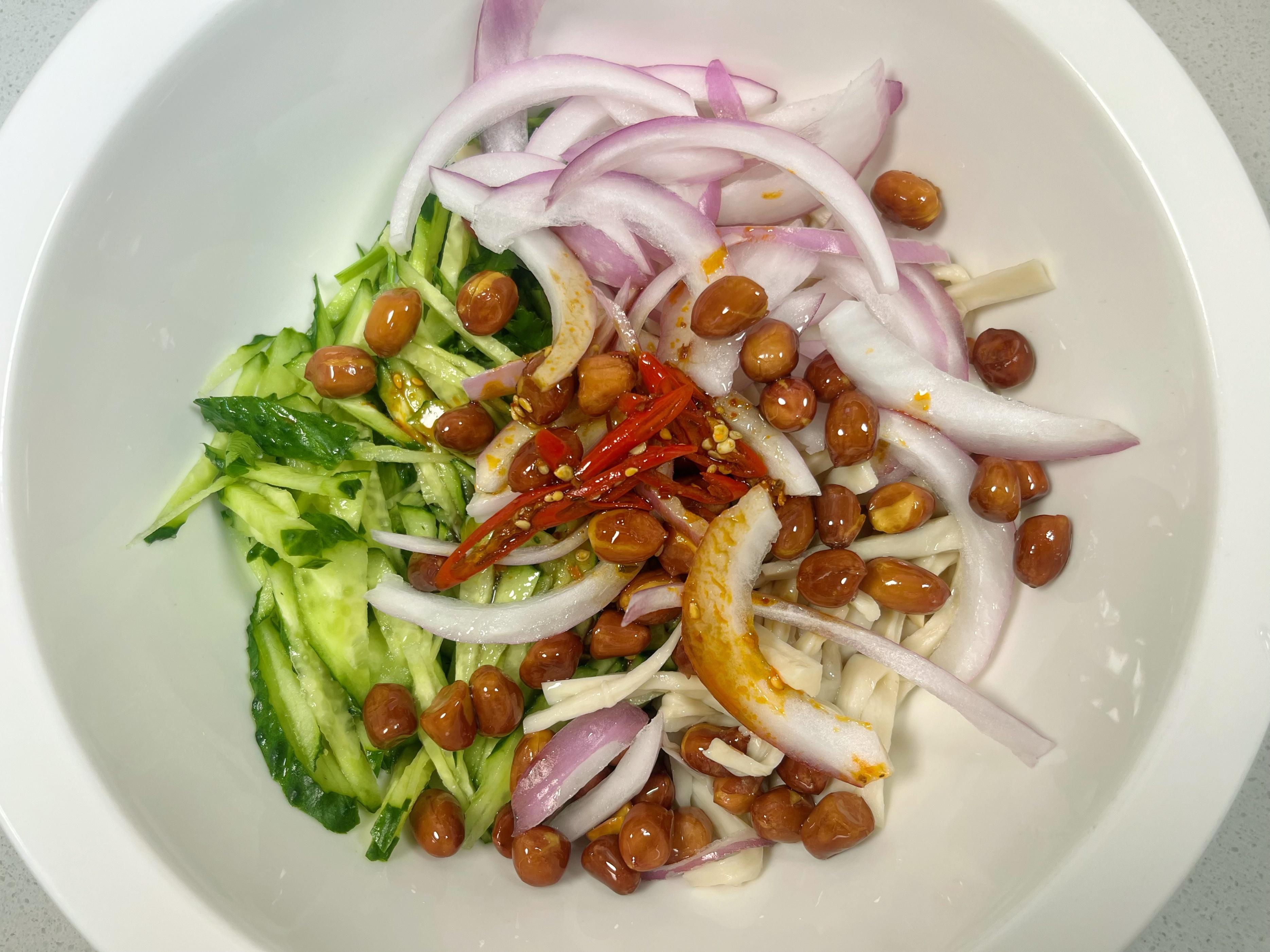 杏鮑菇蒸完撕成條,吸飽了酸辣料汁,嚼起來肉乎乎的帶點韌勁;黃瓜絲脆生生,洋蔥絲甜絲絲,炸花生米“嘎嘣”一咬滿口香,層次豐富到一口接一口停不下來!