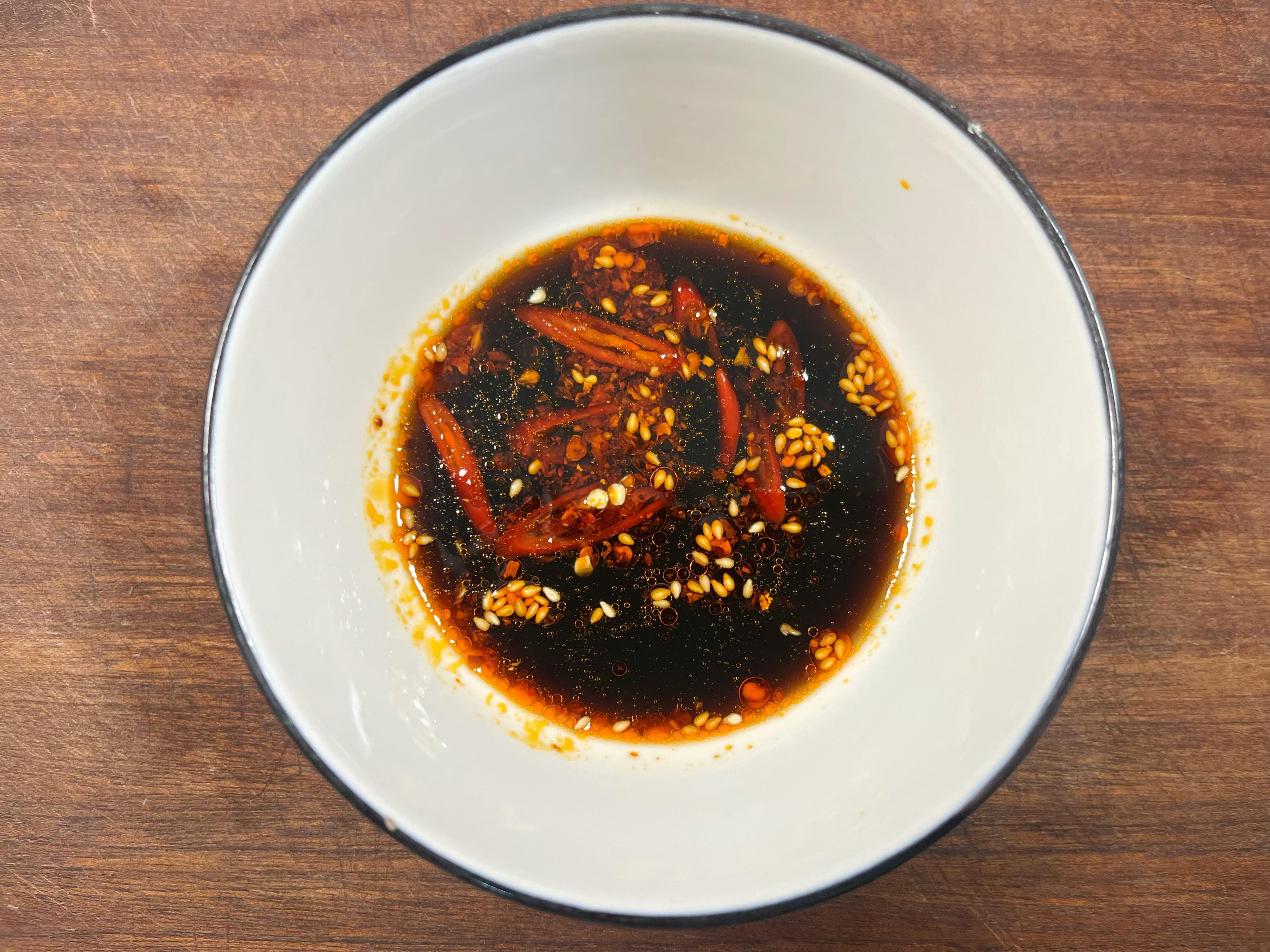 - 加3勺生抽、2勺香醋、半勺白糖、1小勺鹽,再倒1勺花椒油、1勺辣椒油(不喫辣換香油),攪勻後擠半個檸檬汁(沒有就用幾滴白醋替代)。