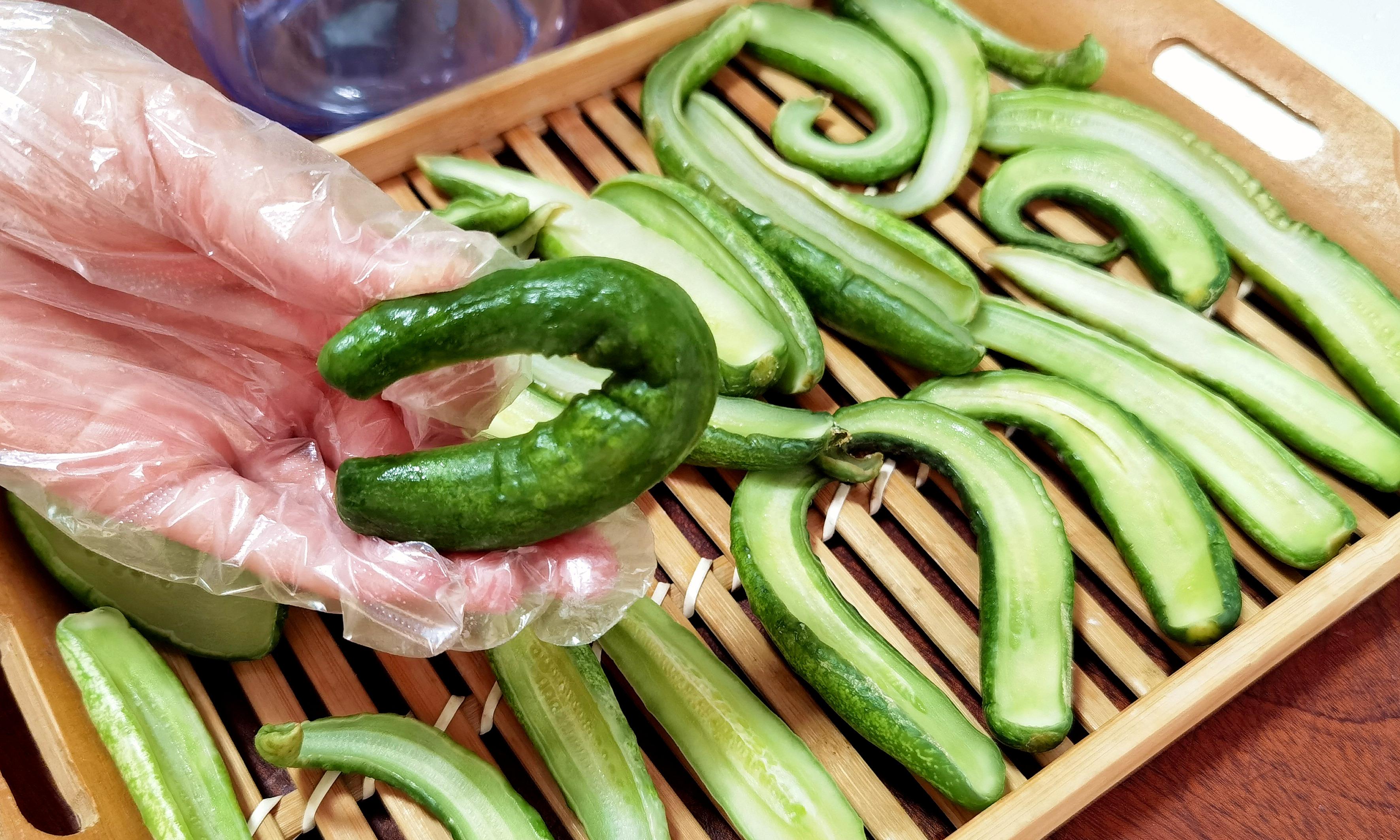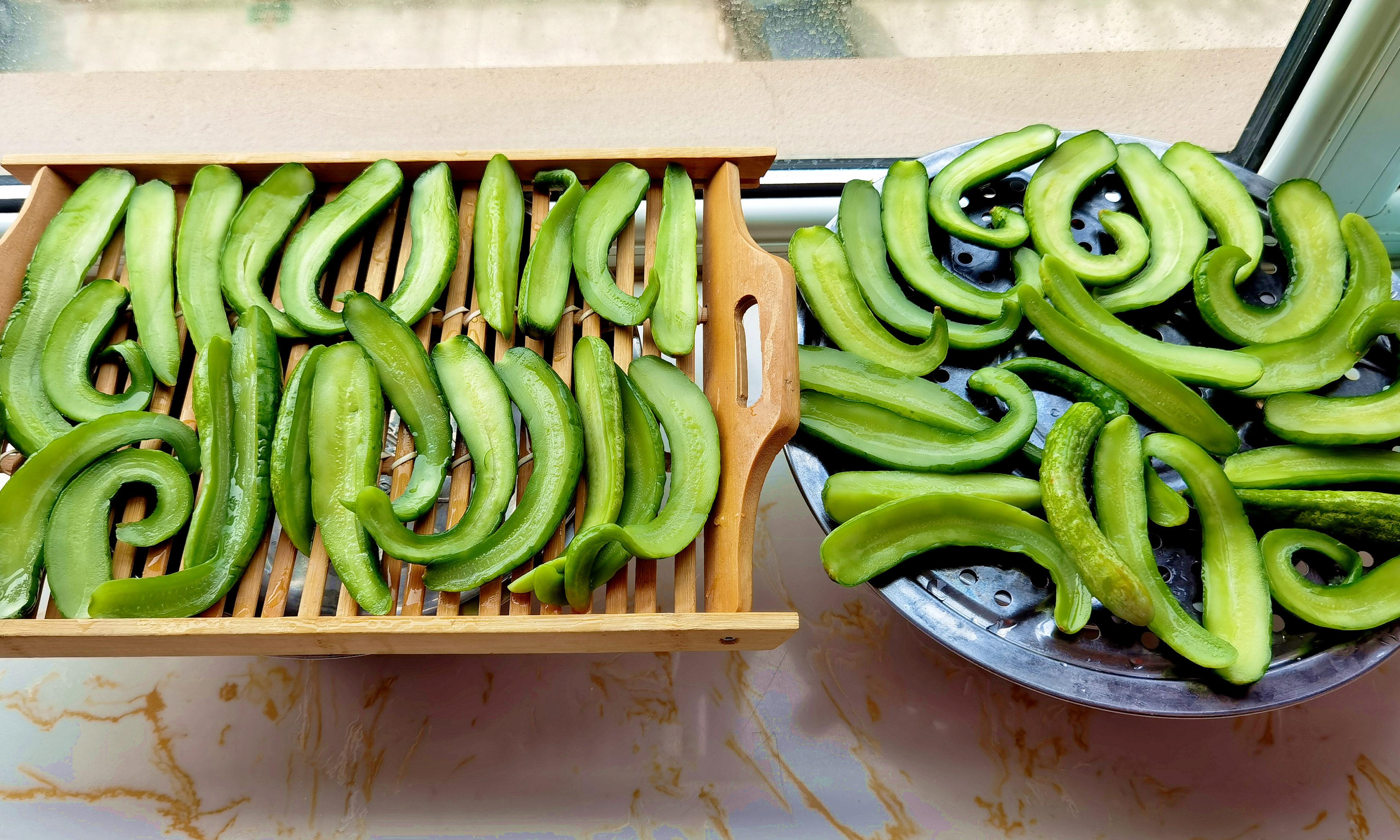 - 首日暴曬:黃瓜條攤在竹匾上,大中午搬出去曬足6小時!中途用筷子翻兩次,曬到打卷兒、捏着“沙沙”響就收工。