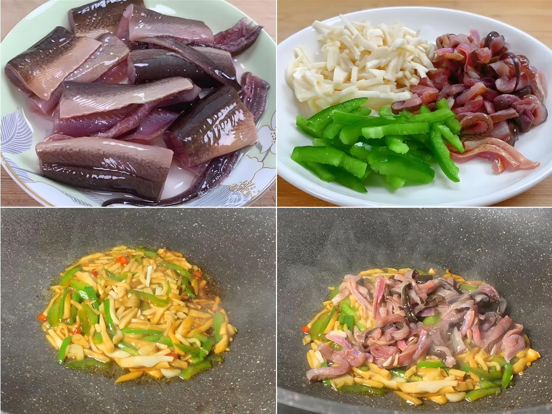 1. 黃鱔用鹽搓去黏液,沿脊骨片出鱔肉切細絲,加料酒醃製;杏鮑菇手撕成條,青椒切細絲,小米辣切圈;
