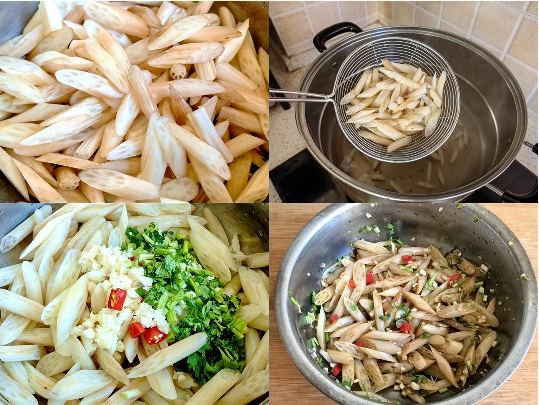 2. 燒一鍋開水,加少許鹽和油,藕帶焯水15秒撈出過冰水;蒜末、小米辣圈用熱油激香,加2勺白醋、1勺糖、半勺鹽調汁;