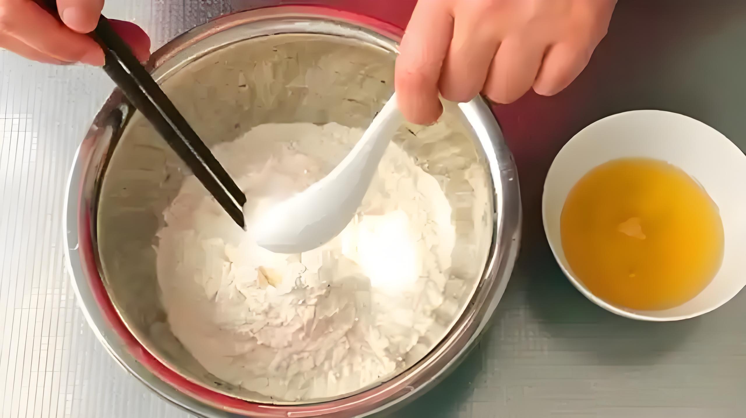 - 麪粉裏挖個坑,倒酵母和剩下的20克白糖(糖能幫酵母發酵),慢慢倒入溫水,邊倒邊用筷子攪成絮狀。