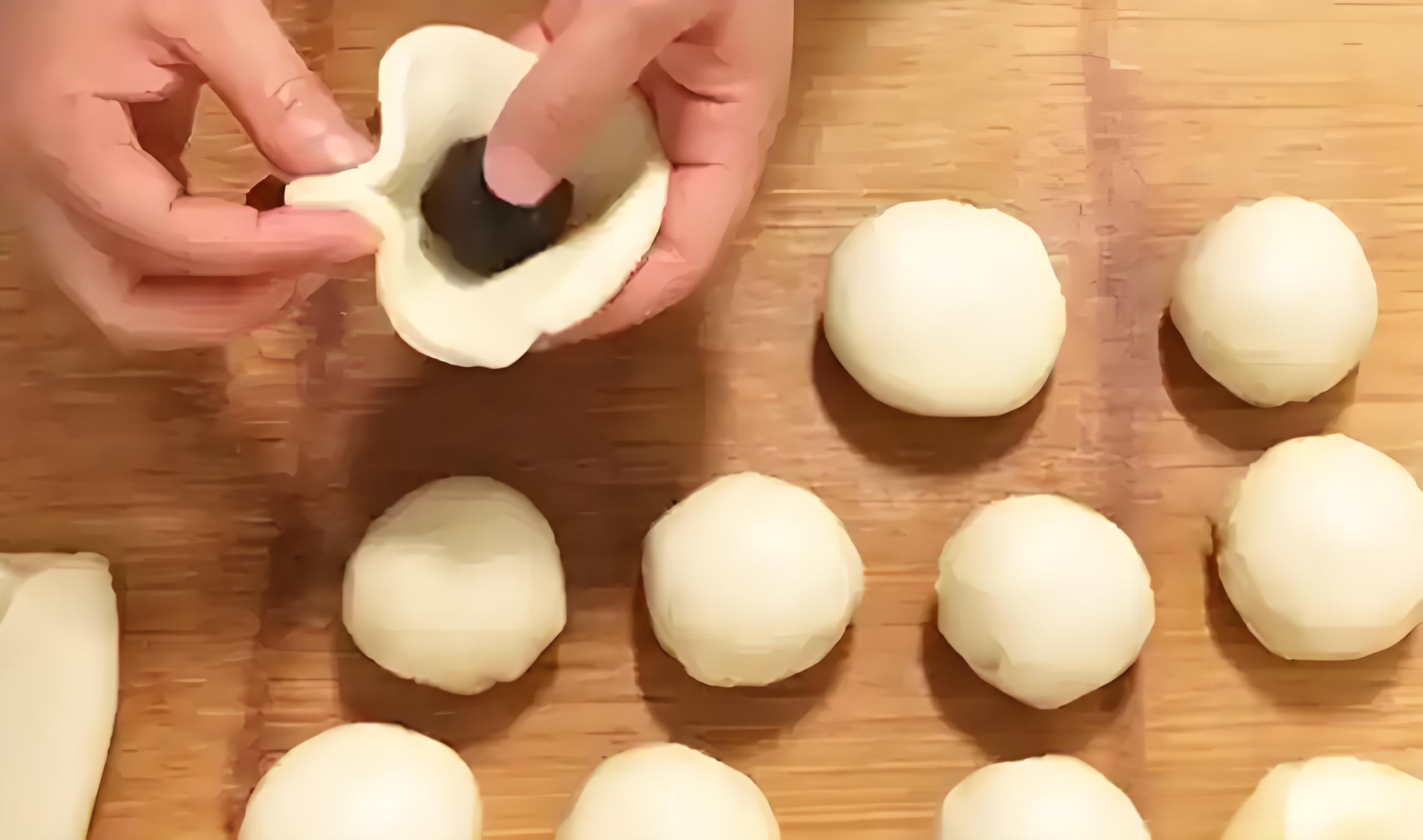 - 劑子擀成中間厚、邊緣薄的麪皮,挖一勺紅豆沙放中間(別貪多,容易漏餡)。