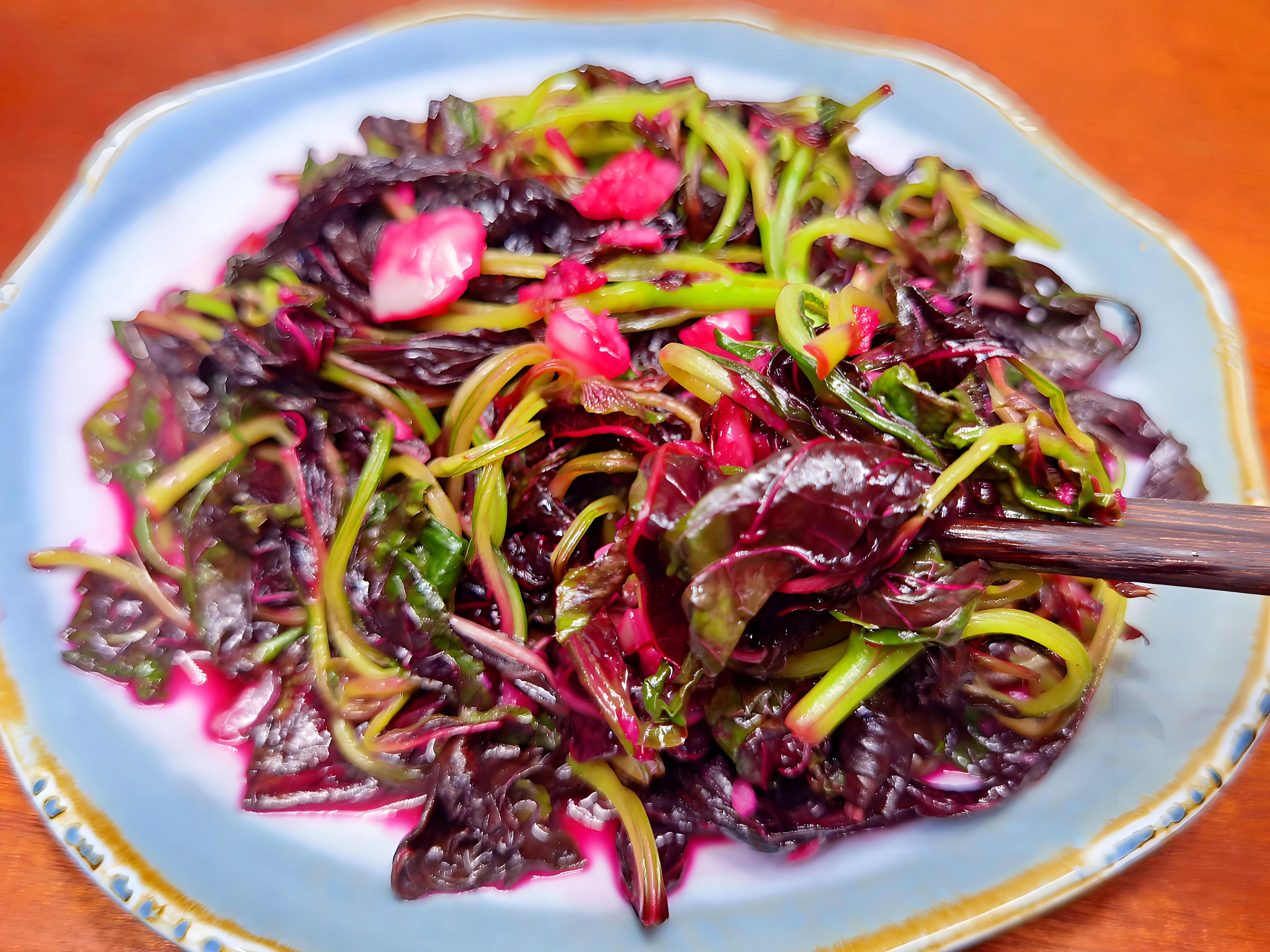 點評:這道菜只需3分鐘,蒜香與莧菜清甜完美融合,紅潤湯汁拌飯尤其開胃,是夏日餐桌的"下飯神器"。