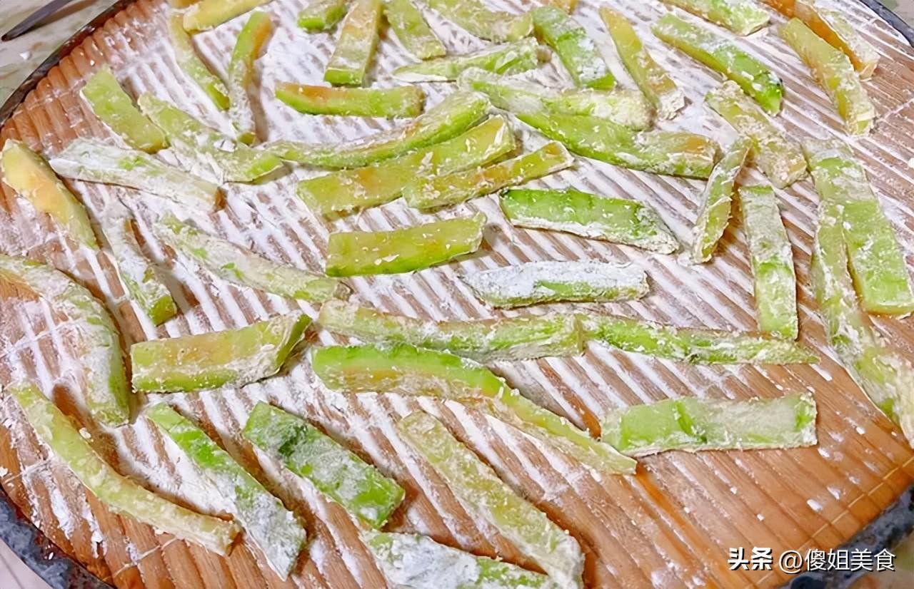 第二步:處理好的瓜白被老媽麻利地切成手指粗細的長條。接下來這步是關鍵!只見她抓一大把普通麪粉(對,就是蒸饅頭包子那種),像天女散花似的,均勻地撒在瓜皮條上,然後雙手翻飛,溫柔又利落地抓拌均勻。我好奇問:"媽,這麪粉是幹嘛的?"老媽得意一笑:"笨!防蟲子惦記,也防它們黏一塊兒!薄薄一層就夠,別糊上啊!"麪粉細密地裹在每一條瓜皮上,形成一層極薄的白霜。