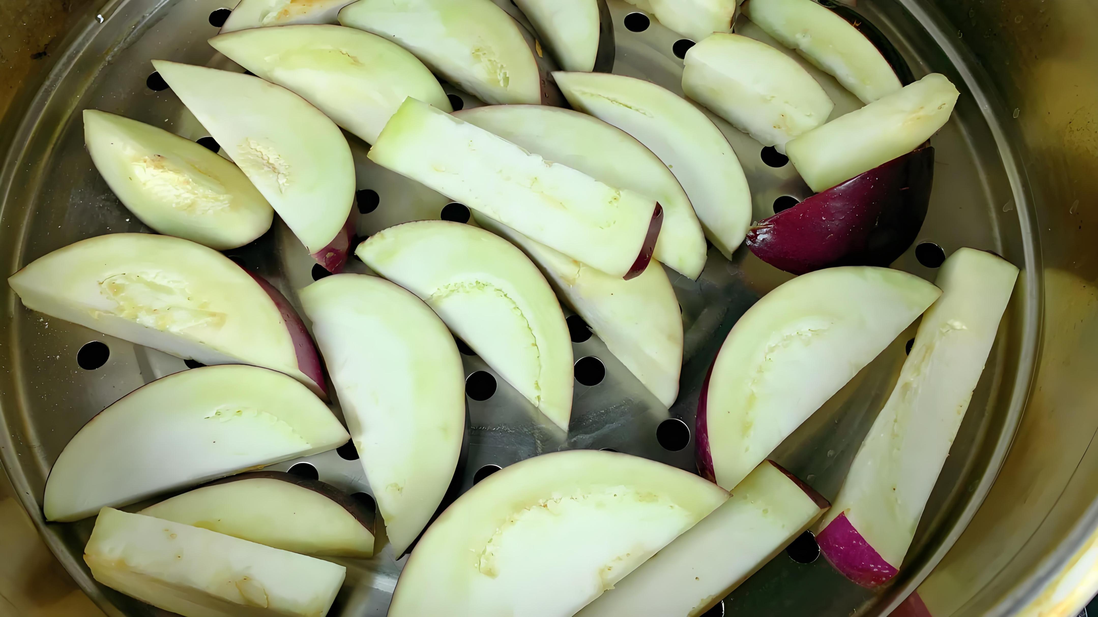 蒸鍋加水,燒開後才請茄子上場——滾沸的水汽,是茄子鮮嫩不變色的另一重保障。撈出泡好的茄子,無需控得過於乾燥,帶點溼潤正好。將茄子條在蒸屜上鋪開,如同列隊一般,彼此間留出空隙,讓蒸汽得以自由穿梭其間。蓋緊鍋蓋,大火猛攻,蒸上八到十分鐘足矣。