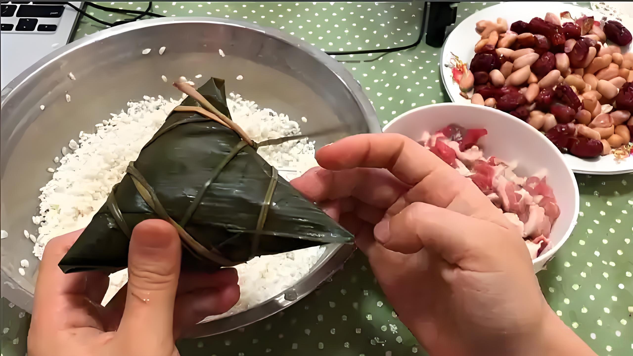 3、蓋被子:把上面的糉葉折下來包嚴實,捏出四個角,綁繩子時別使太大勁,不然煮的時候糯米發脹會撐破。