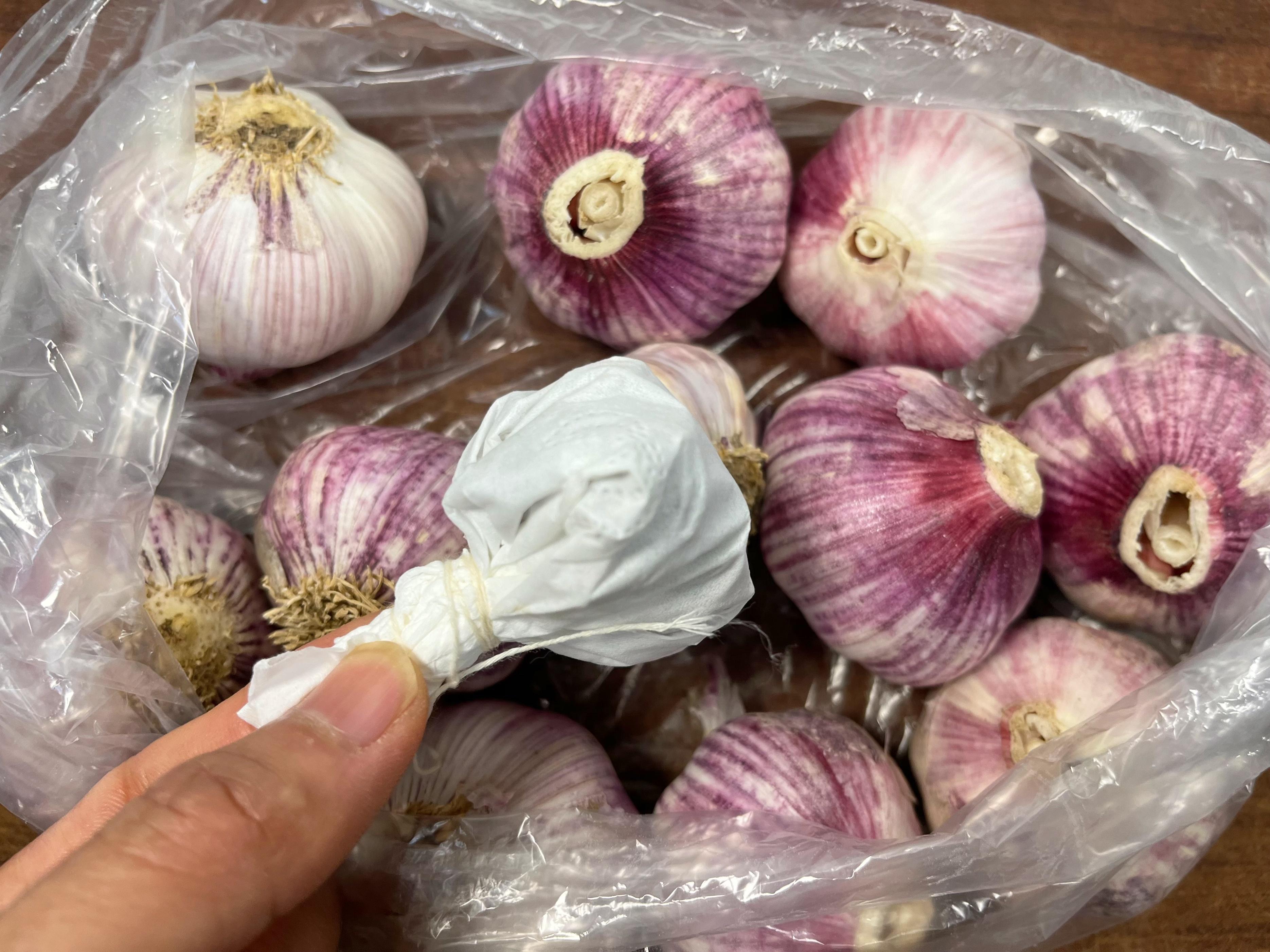 1、新買的大蒜,底下那撮根鬚稍微留長點,別貼着蒜頭剪光。