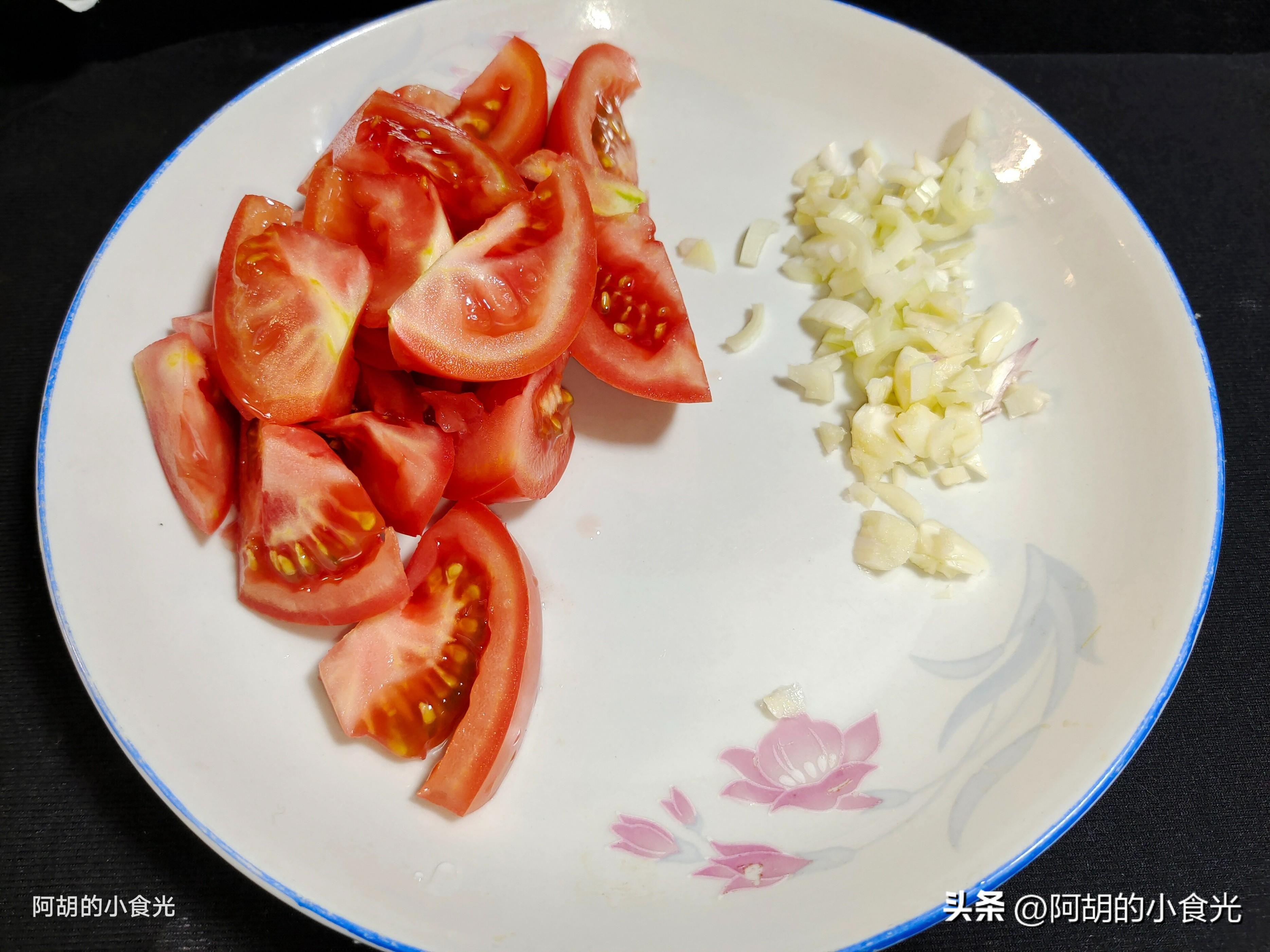 第四步:所有食材準備好並且預處理完成後就可以開火烹飪了。先把鍋燒熱,淋入一些食用油小火燒熱,加入蔥蒜炒出香味,接着將西紅柿塊倒入鍋中煸炒,略微炒出西紅柿的湯汁。