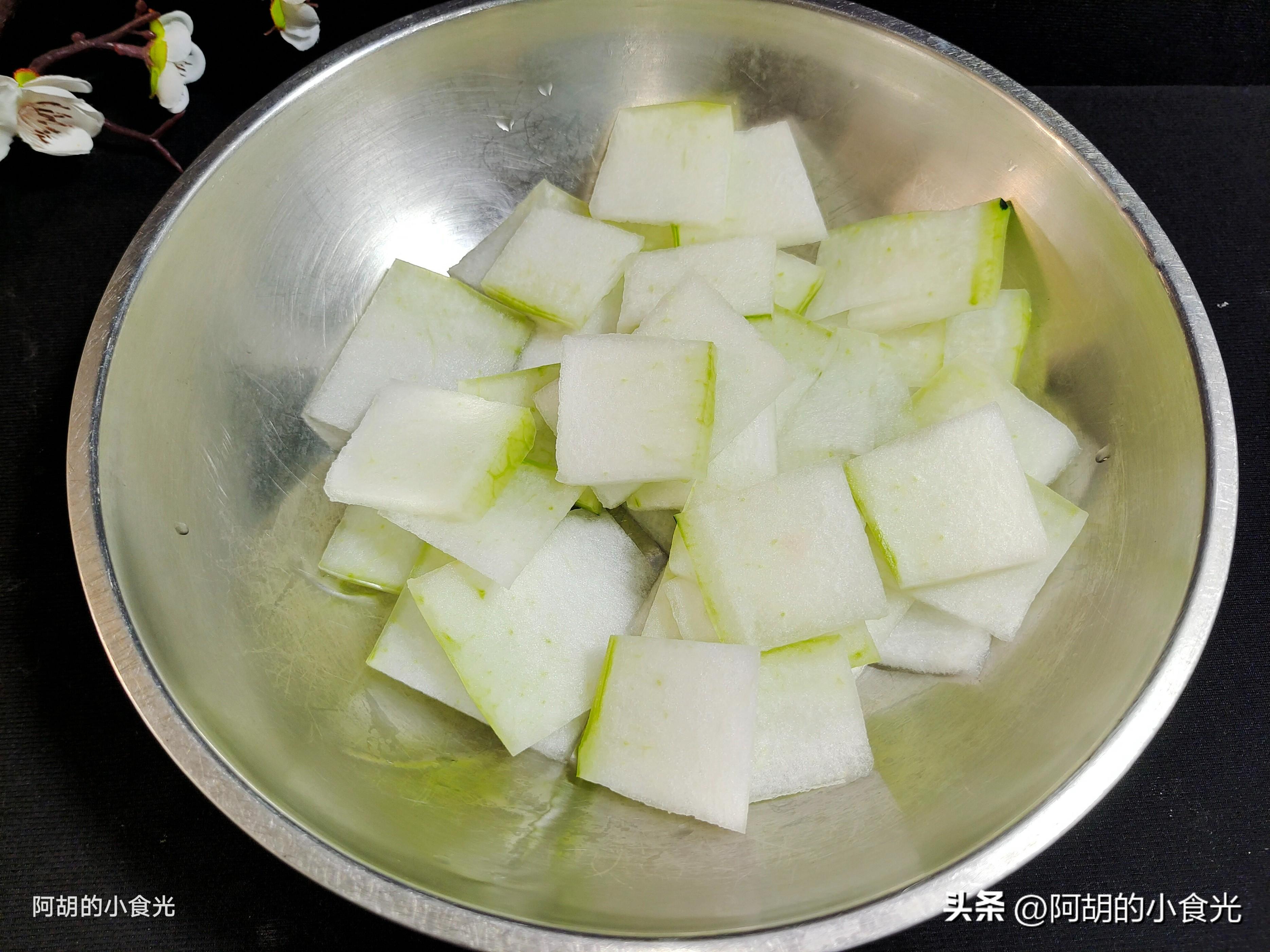 第一步:準備冬瓜一塊,將外皮和瓜瓤全部去掉,而後再將瓜肉切成厚片放入碗中待用。也可以根據自己的喜好將其切成塊。