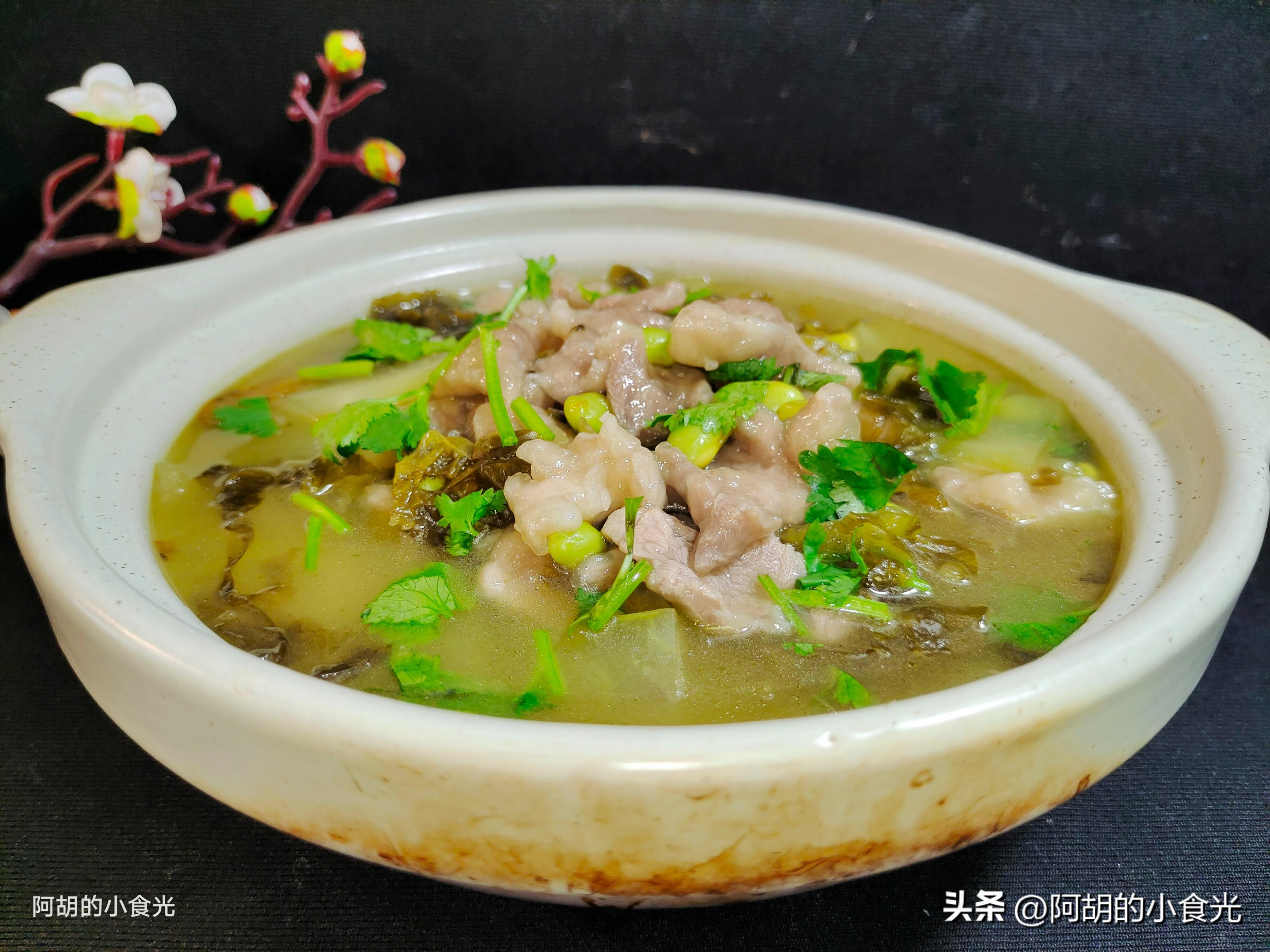 第七步:取出燙好的“滑肉”倒入鍋中,略微攪拌一下繼續保持大火煮個一分鐘左右,最後再品一品味道,不夠的再做最後的微調,最後撒入一些香菜碎就可以出鍋裝盤了。很是清爽開胃的一道湯菜,肉片滑嫩入味,冬瓜再有了酸菜和毛豆的提味之下,變得更有滋味,特別得下飯,感興趣得一定要試一試這個喫法。