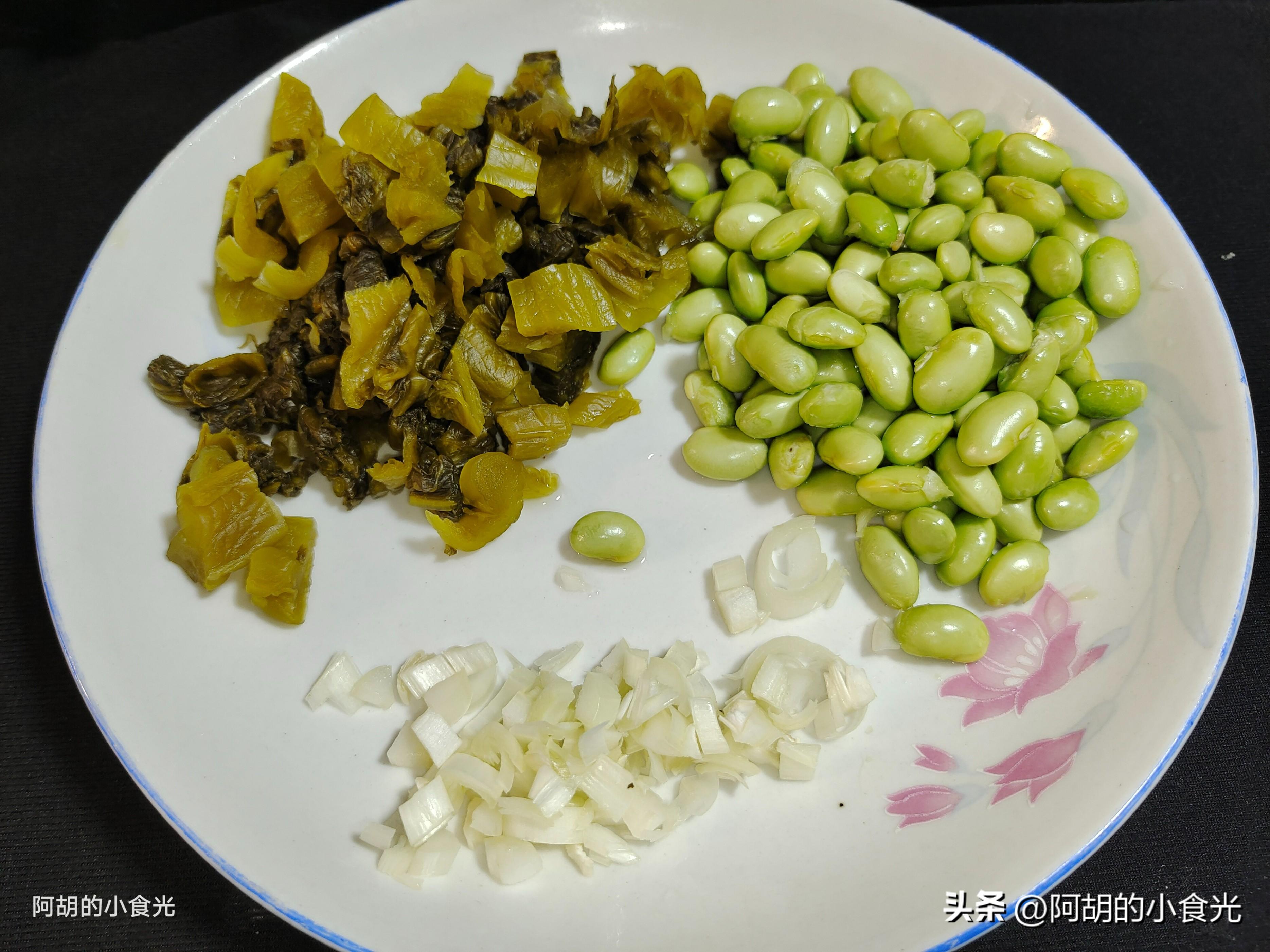 第二步:所需要的配菜很簡單,一小包的魚酸菜(超市的袋裝黑酸菜),取出後用清水沖洗掉多餘的鹽分,而後擠幹水分切碎待用。再來適量的鮮毛豆仁洗乾淨後備用,一些蔥蒜末作爲小料使用。