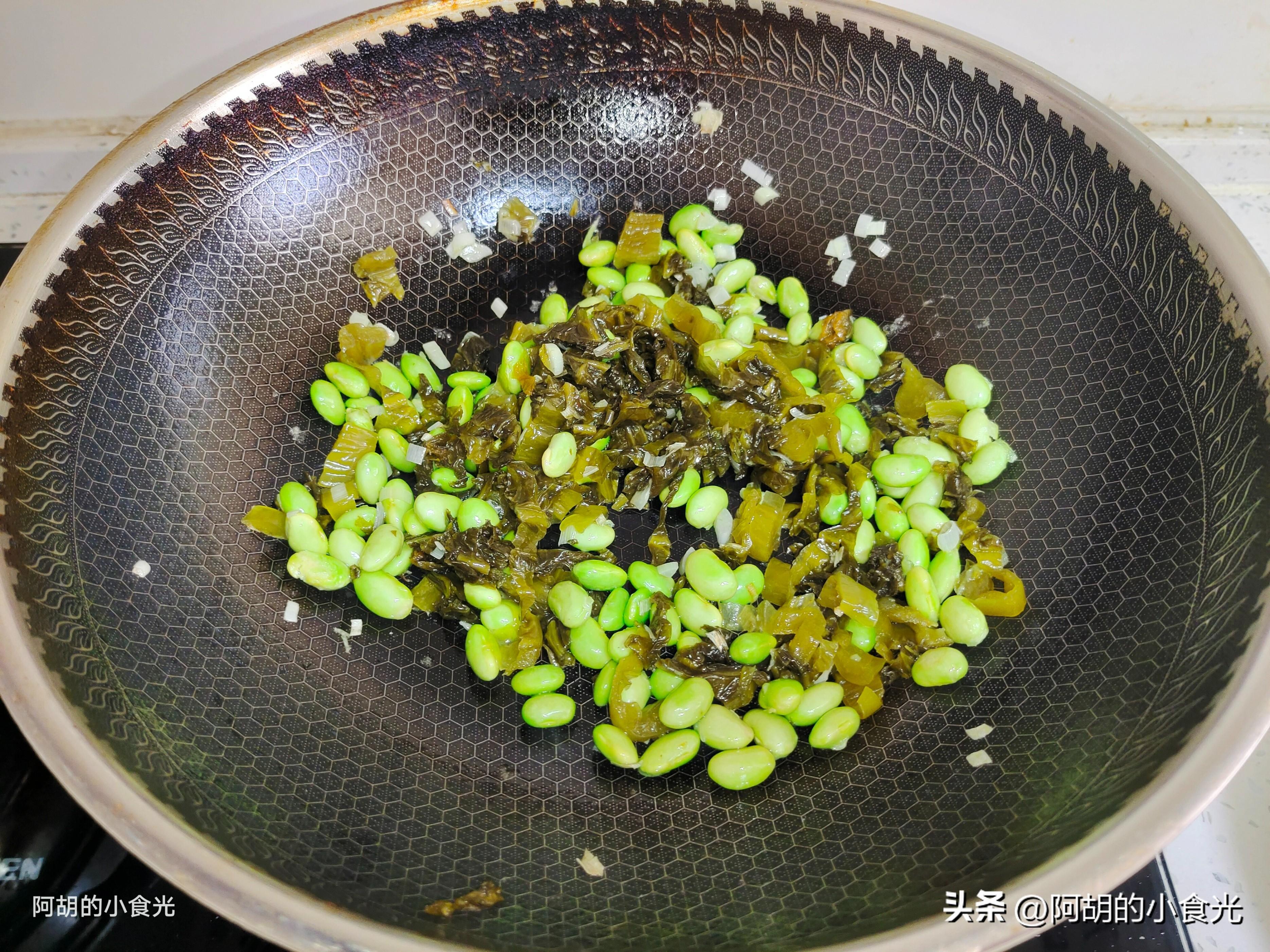 第五步:另起鍋燒油,這裏最好添入適量的豬油,油熱後把蔥蒜末倒入鍋中炒出香味,接着將酸菜和毛豆仁下鍋炒一炒,炒出食材的鮮香味。