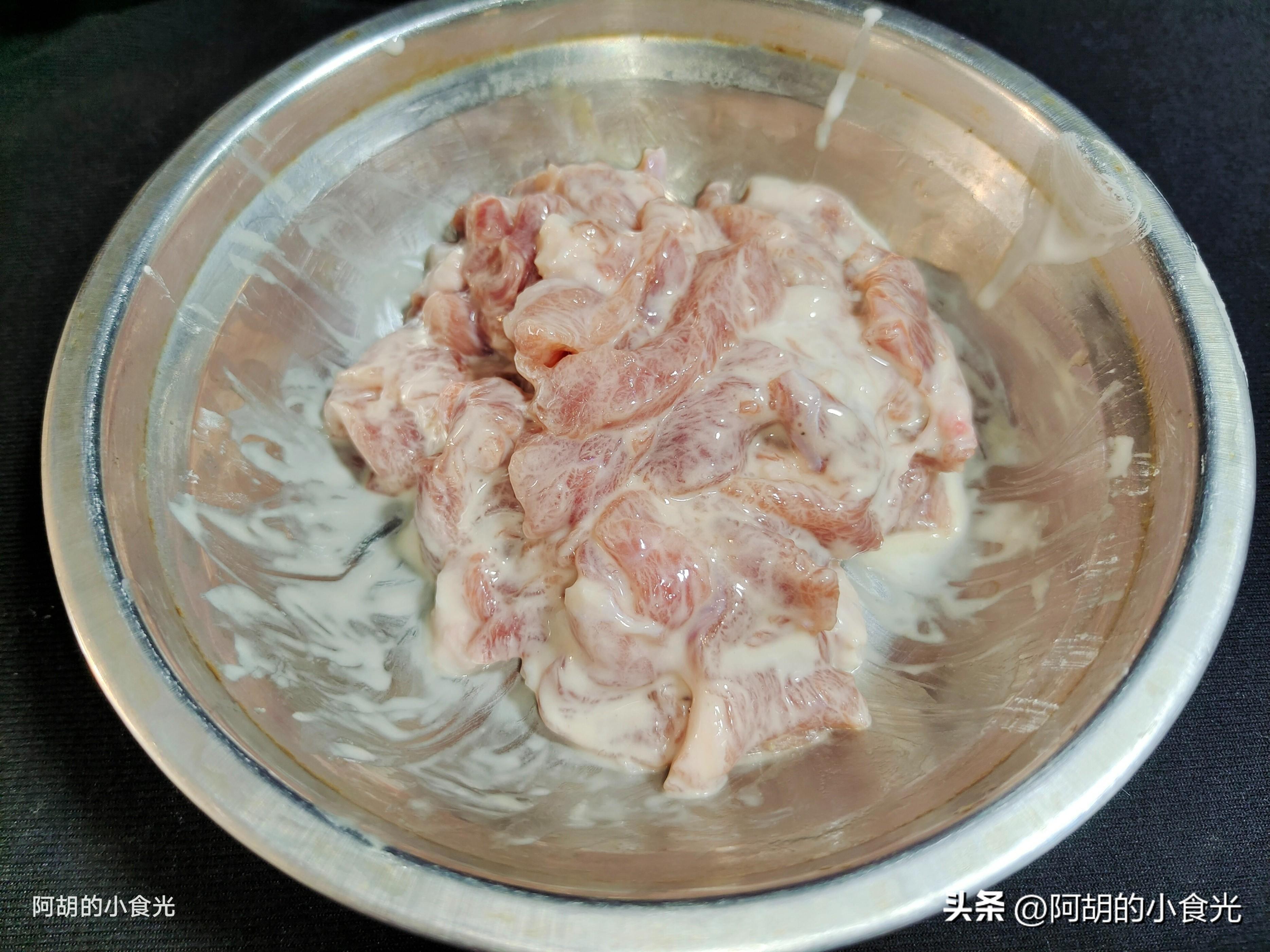 第三步:再來準備滑肉部分,準備一塊豬梅花肉的瘦肉部分,洗乾淨後將其切成片放入碗中,撒入一些食鹽,松茸鮮和少許料酒抓拌均勻,讓瘦肉吸收多餘的水分而呈現一些粘性。而後倒入用紅薯澱粉調製的粉漿(一定要稠一些),抓拌至每一片肉都裹滿粉漿。