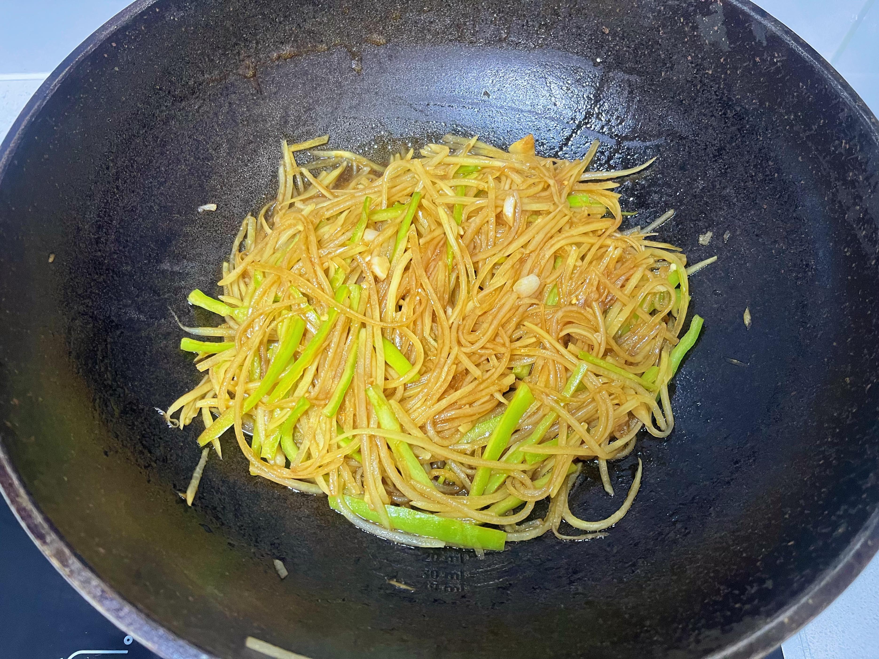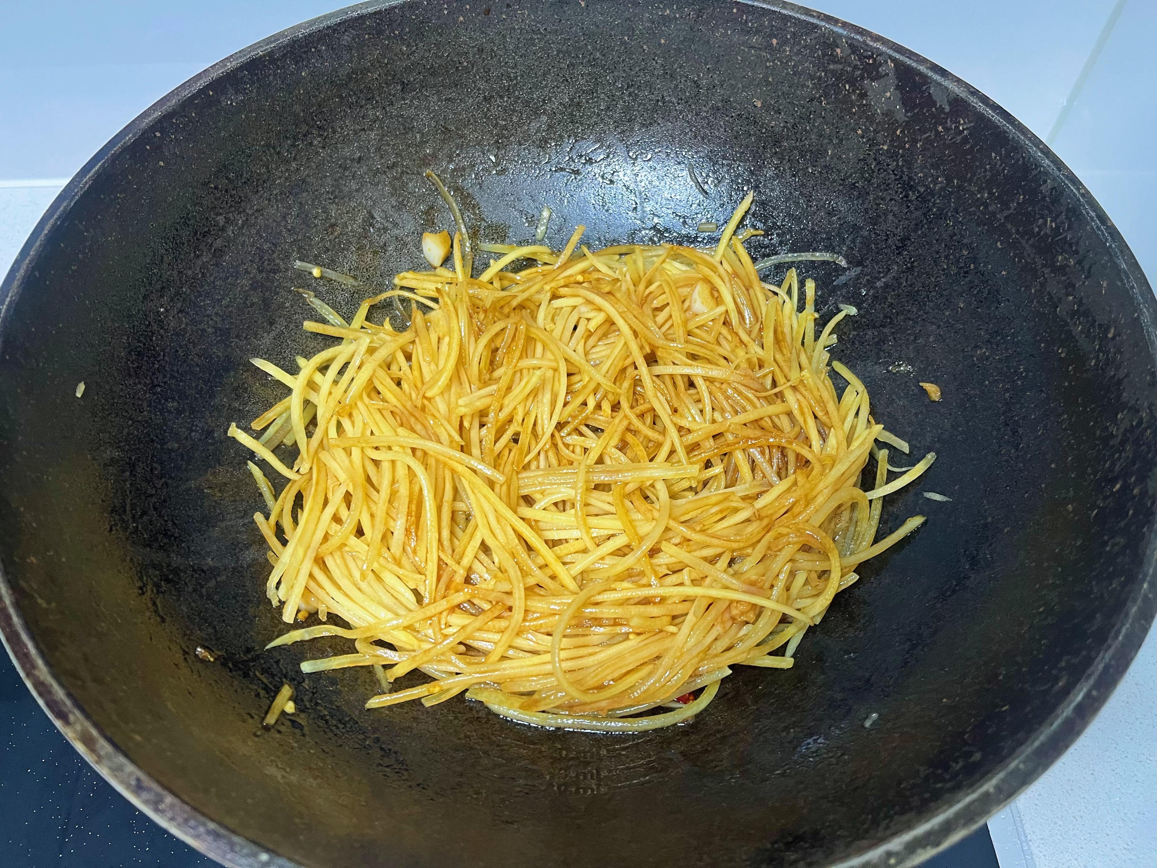 3、主角登場!處理好的土豆絲傾入鍋中,立刻調至最大火力。鍋鏟要快,翻炒要勻,讓每一根絲都裹上油亮的熱情。約摸一兩分鐘,眼見土豆絲顏色轉爲半透明,邊緣微微卷翹,脆生生的狀態剛好。