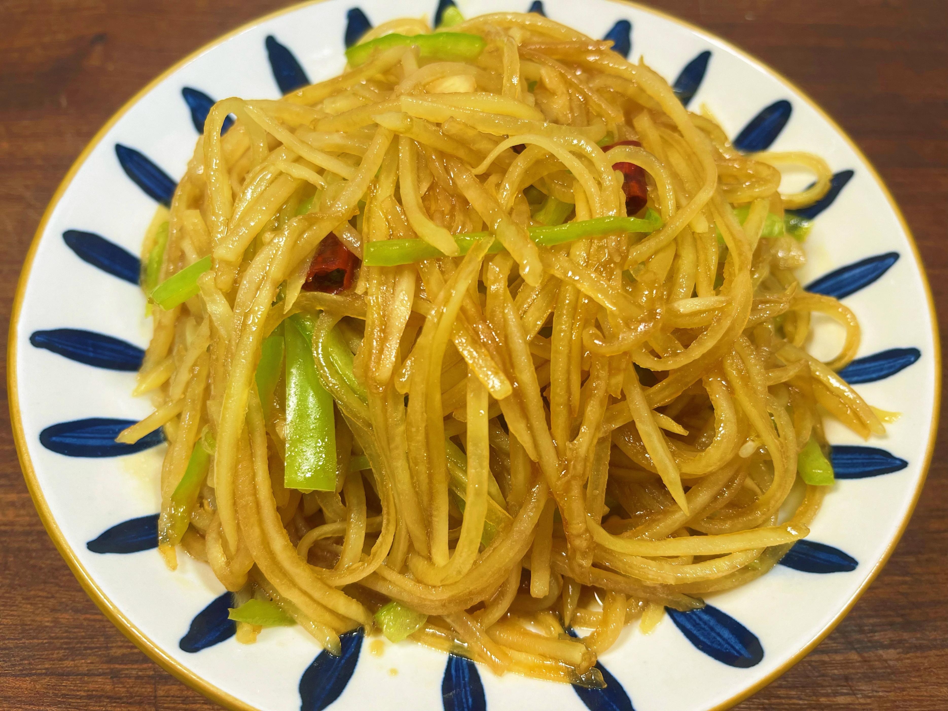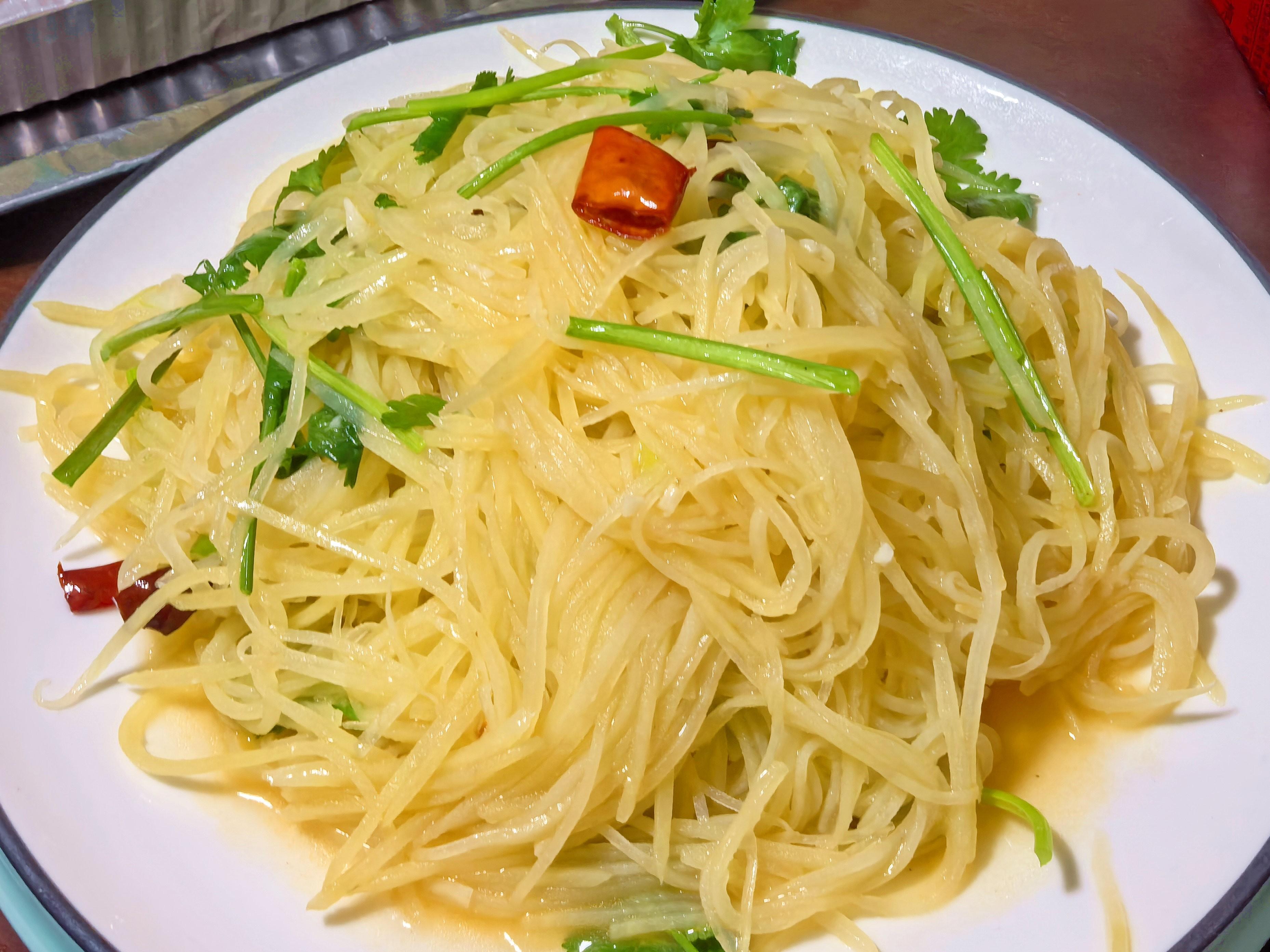 根根土豆絲精神抖擻,泛着誘人油光,點綴着點點紅椒與翠綠蔥花。夾一筷入口,牙齒輕叩,“嚓”的一聲脆響,醋香提攜着土豆本真的清甜在舌尖躍動,熱辣辛香緊隨其後。一盤尋常土豆絲,竟能如此爽利分明,滋味飽滿,鍋底更是乾乾淨淨,毫無糾纏——果然,美味背後藏着的,無非是那一點洞察與耐心。