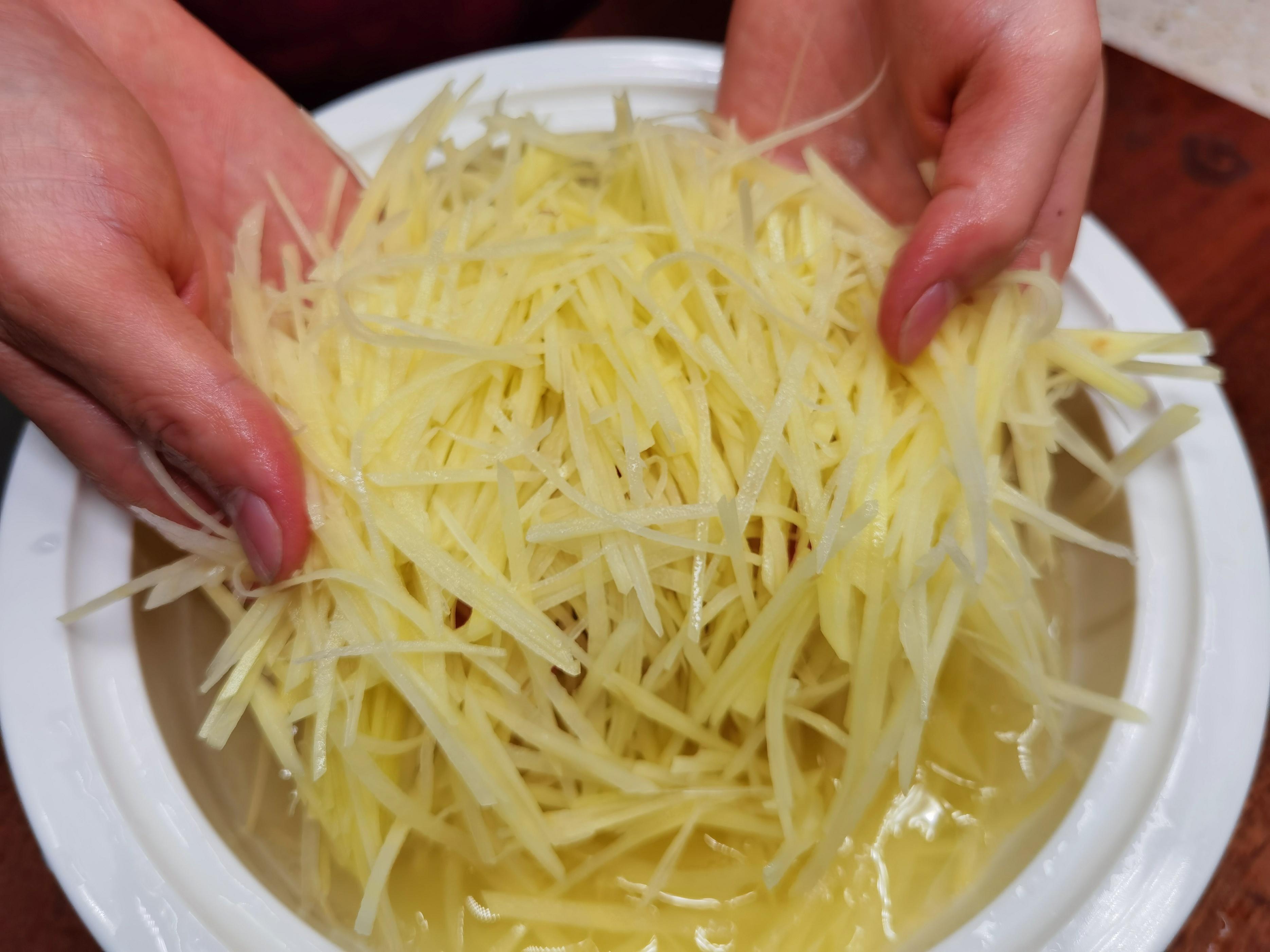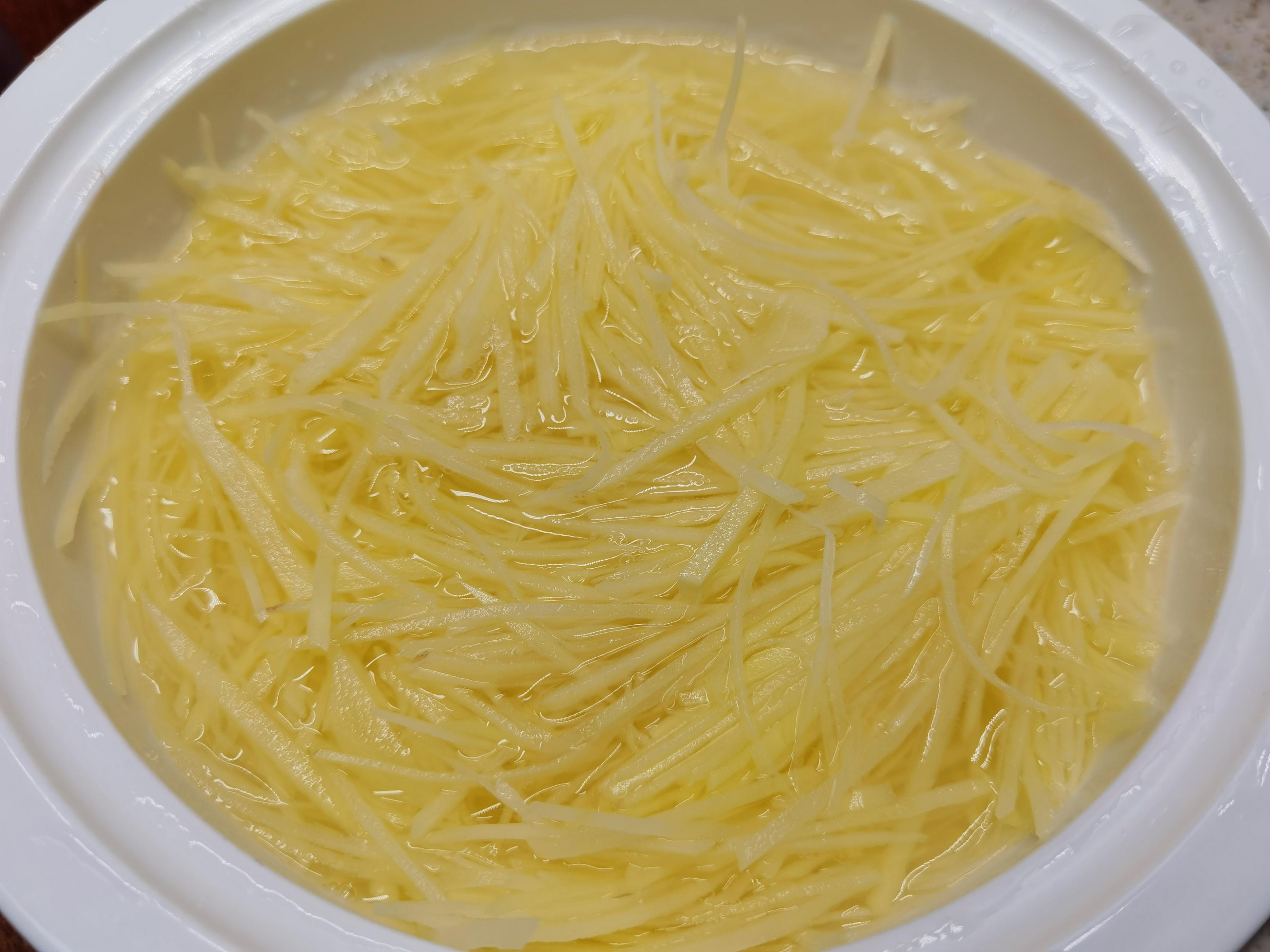 1、準備好2個土豆去皮,改刀切成細絲,刀工不好的可以用擦絲器,然後將土豆絲放入盆內,倒入適量的清水,來點米醋,浸泡5分鐘,最後多淘洗幾遍,瀝乾水分。