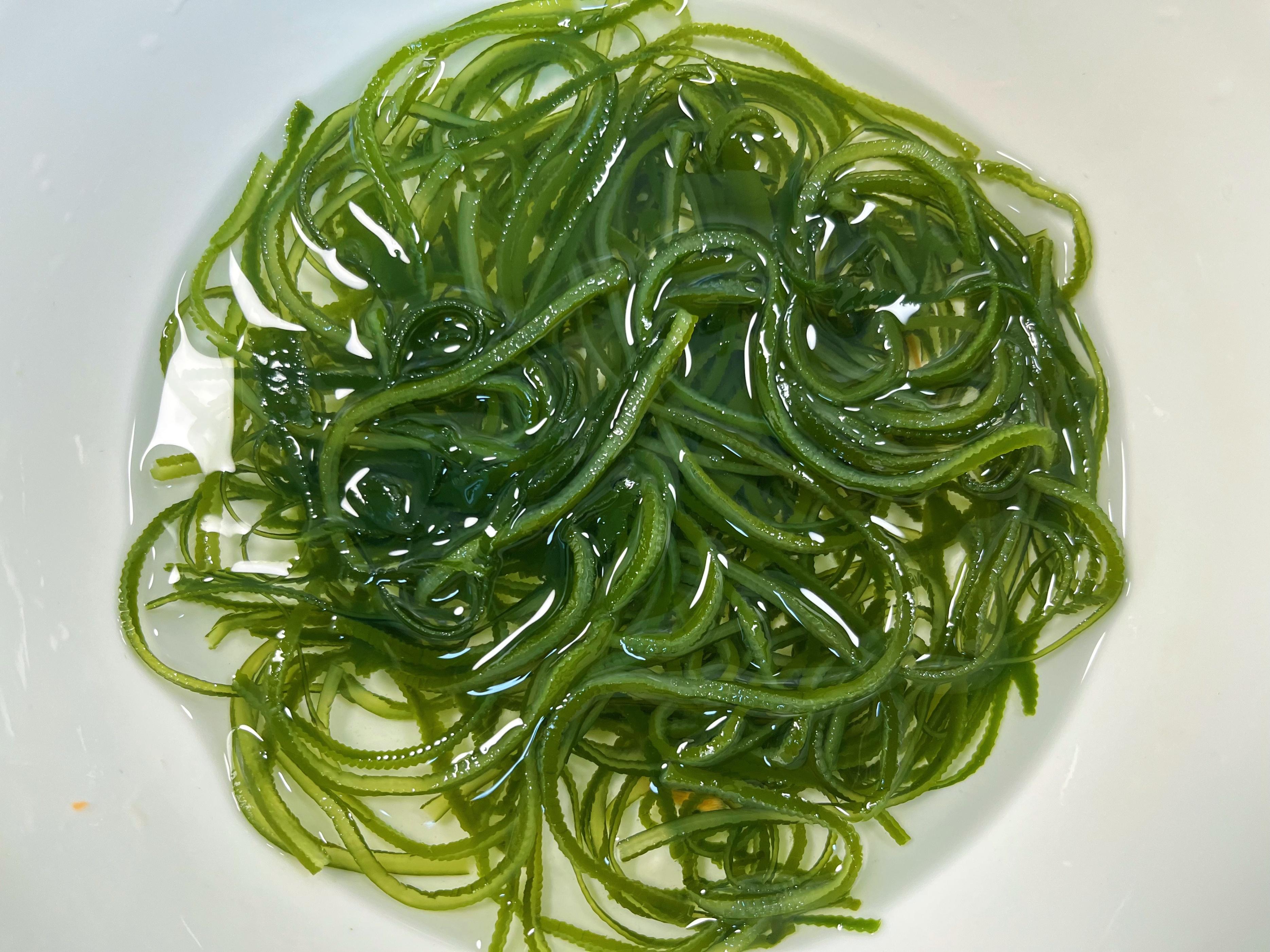 - 煮海帶絲: 水沸騰後,先把處理好的海帶絲放進去煮。煮個3-4分鐘就行。煮好後,立刻撈出來,馬上過一下涼白開或者純淨水(這步很重要!能讓海帶絲口感更脆爽,顏色也好看)。過完涼水,瀝乾水分。