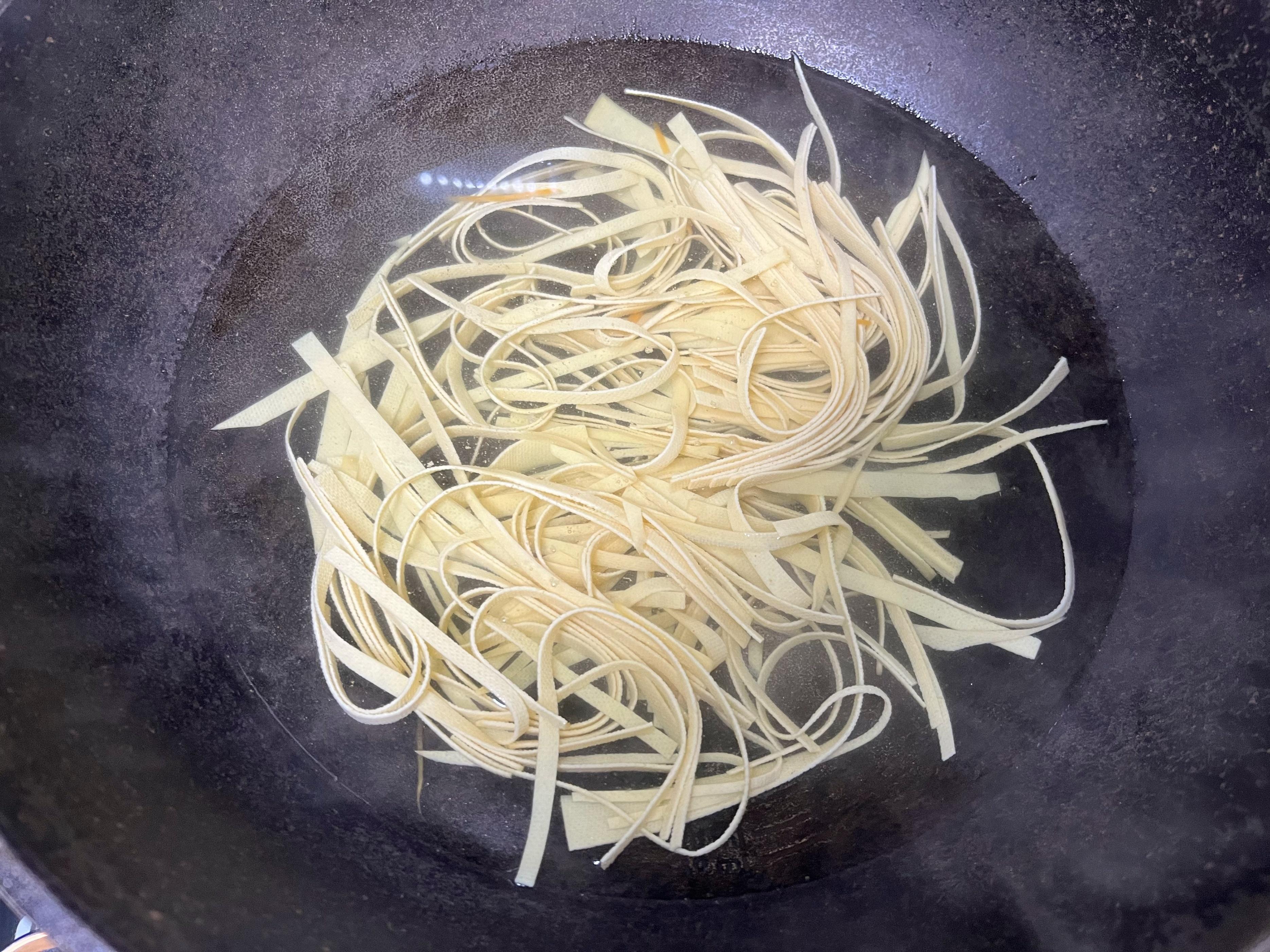 - 燙豆皮絲: 鍋裏水繼續保持沸騰,把攥幹水分的豆皮絲倒進去。豆皮絲本來就是熟的,只需要在開水裏打個滾兒,燙個30秒左右,看到它完全變軟、顏色更鮮亮了,就趕緊撈出來瀝乾。千萬別煮久了! 煮久了軟塌塌的沒口感。