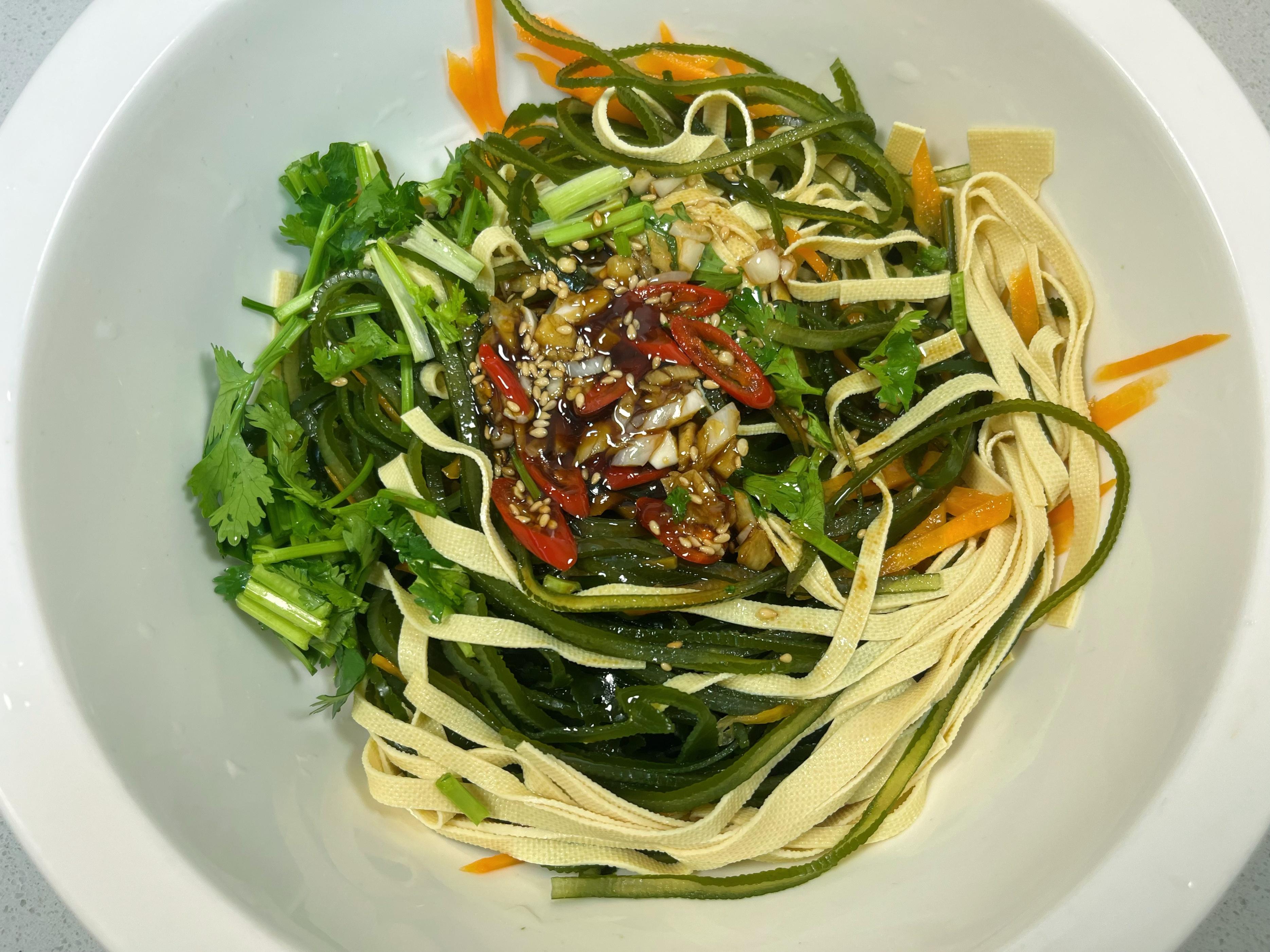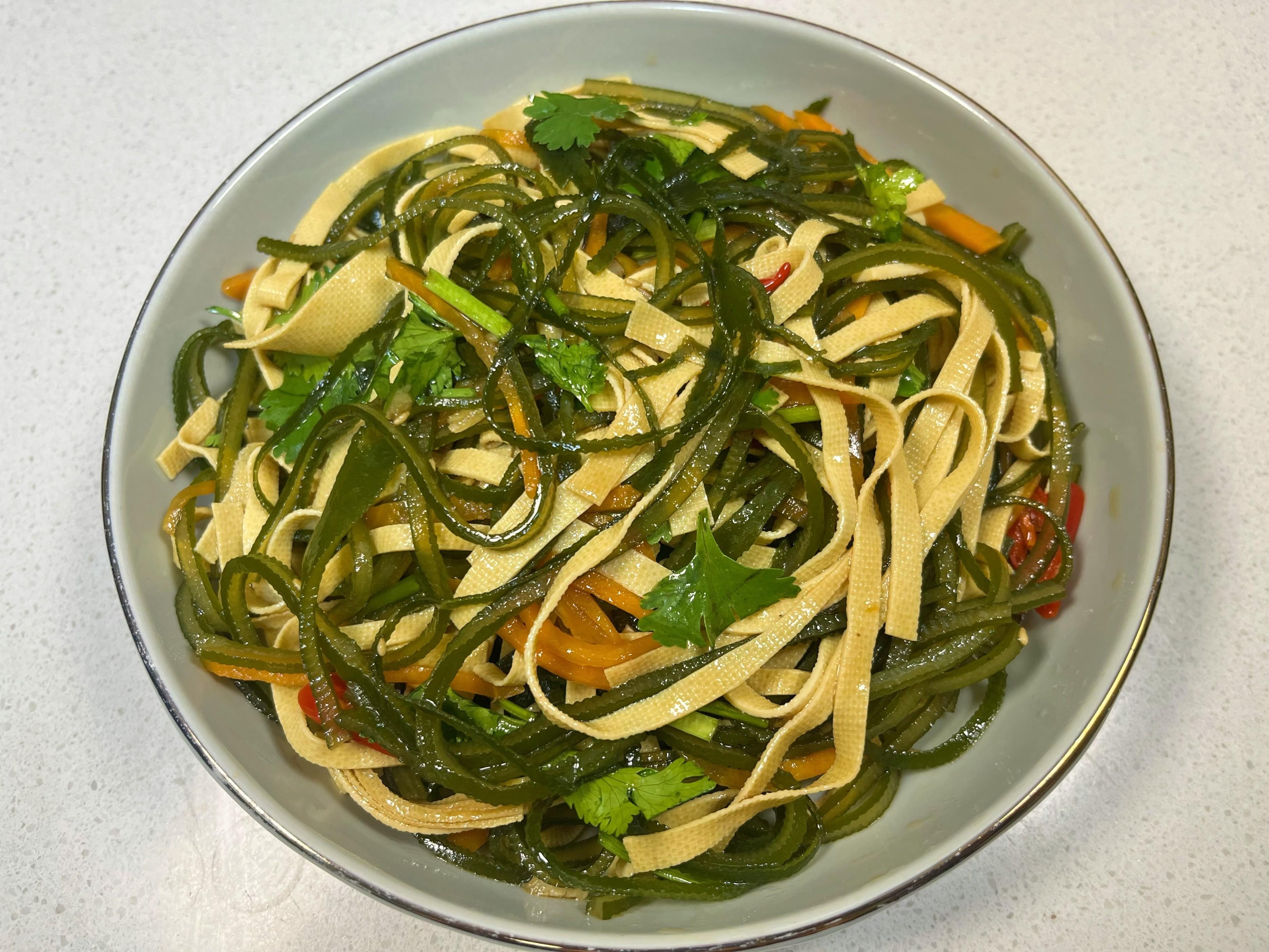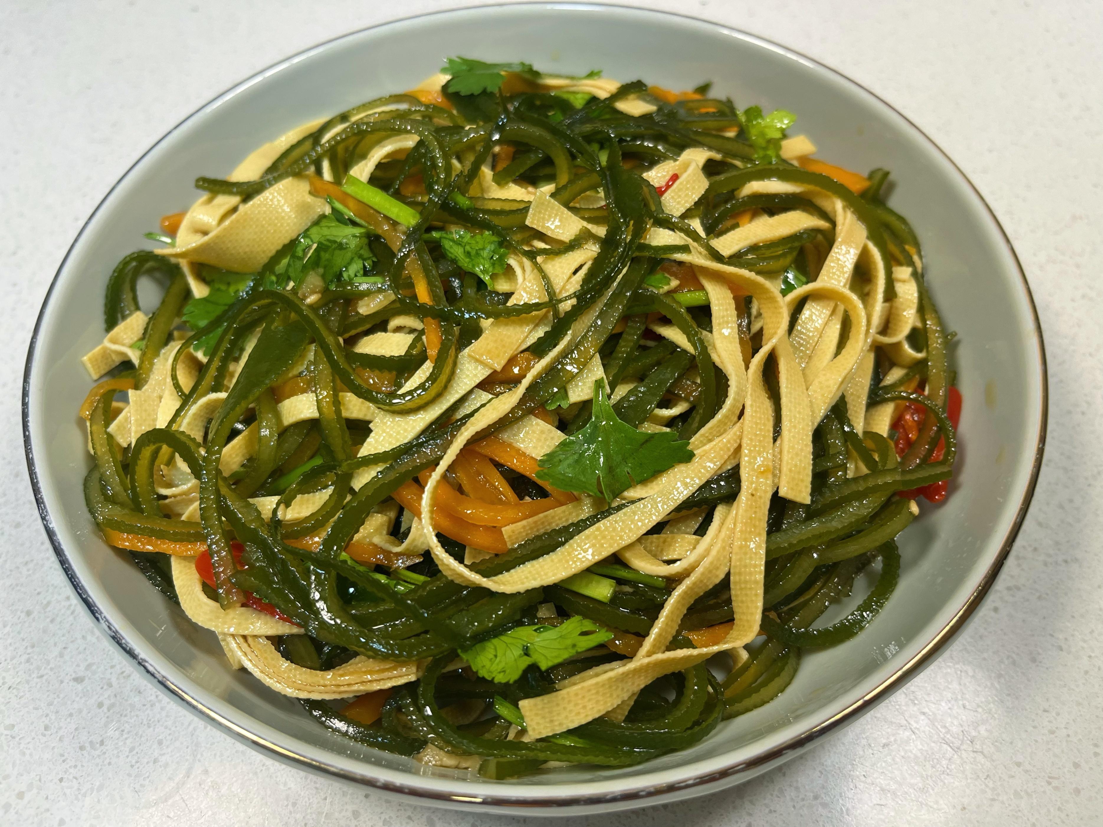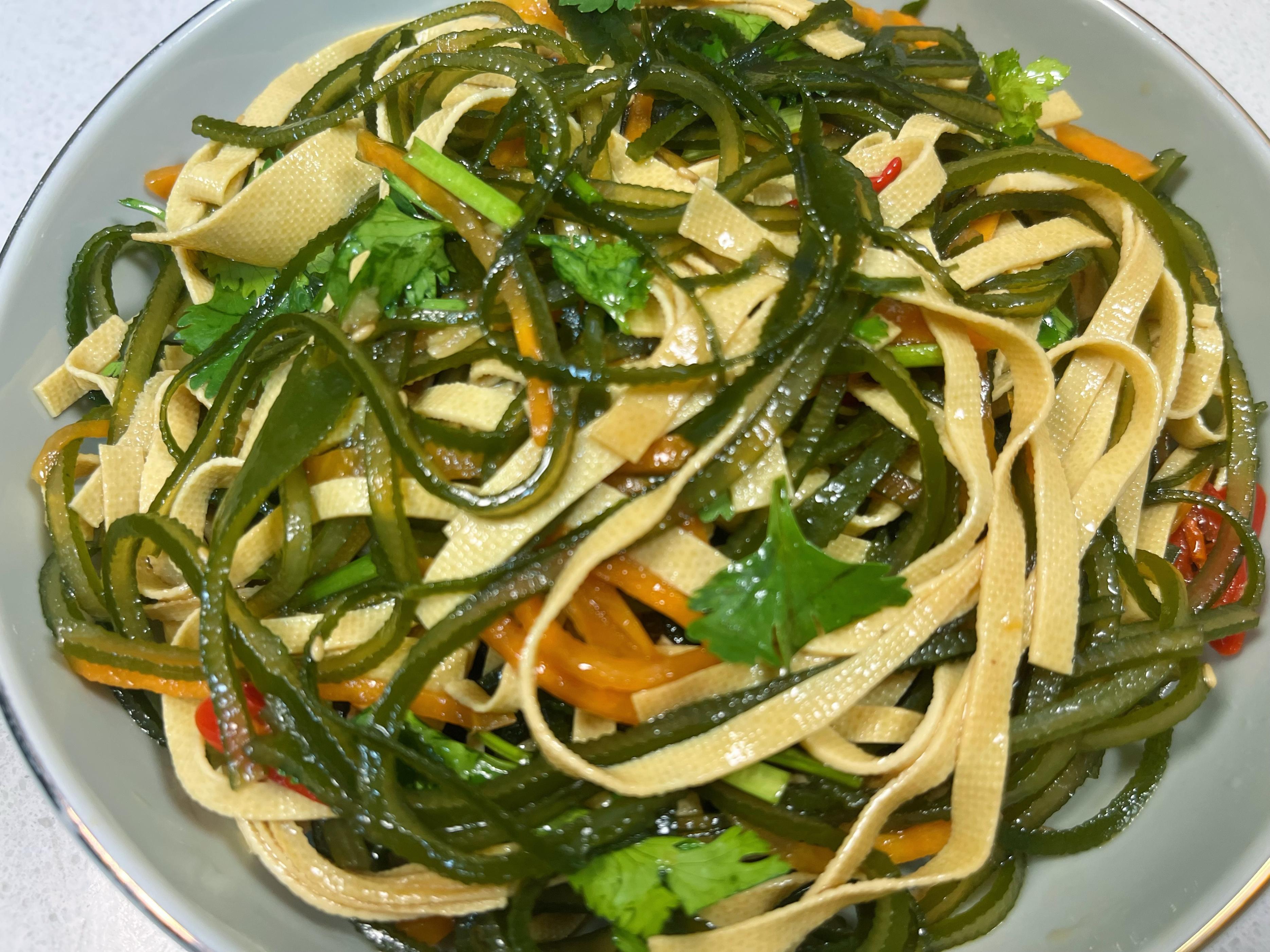 - 開拌! 用筷子或者洗乾淨的手(戴手套也行),從下往上、兜着盆底翻拌,讓每一根海帶絲、豆皮絲、胡蘿蔔絲都均勻地裹上這亮晶晶、香噴噴的料汁。拌好了,裝盤上桌!