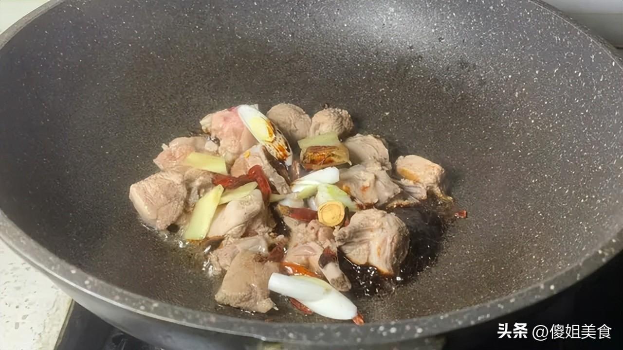 鍋燒熱,倒油,先下一把冰糖。小火慢熬,看着糖粒融化,顏色從淺黃變成透亮的棗紅,焦糖的甜香瞬間瀰漫開來——這就是炒糖色了!火候要準,過了會發苦。糖色炒好,立刻倒入焯過水的鴨塊,快速翻炒。鴨肉在糖色的包裹下,迅速染上誘人的紅亮光澤,油脂也被逼出,在鍋裏滋滋作響,香氣直往鼻子裏鑽。