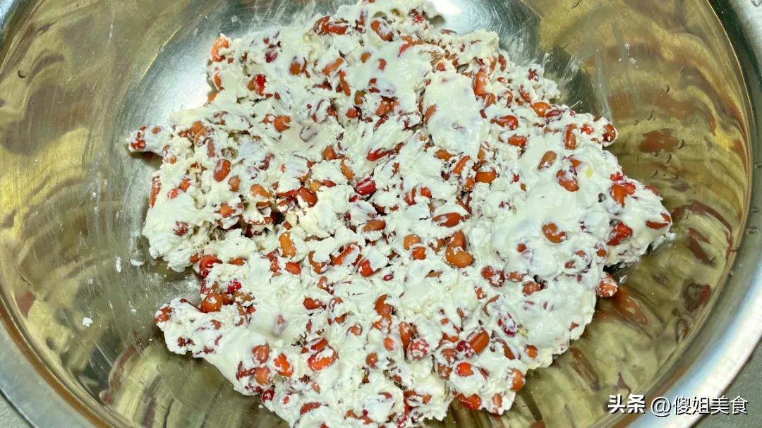 4、趁溫熱,下手揉!把紅豆沙、糯米粉、果乾充分揉合在一起。如果覺得太乾難以成團,可以極其少量地淋一點點溫水。目標是揉成一個溼潤但不粘手、能抱成團的麪糰。紅豆沙的溼度不同,所以加水要非常謹慎,一點點加。