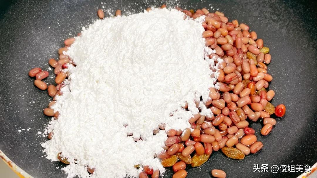 3、在一個大盆裏,倒入糯米粉。把溫熱的、濃稠的紅豆沙(注意不是滾燙的)倒入糯米粉中。用筷子或刮刀開始攪拌。 把洗乾淨的葡萄乾、剪成小粒的紅棗(去核!)也一起倒進去。
