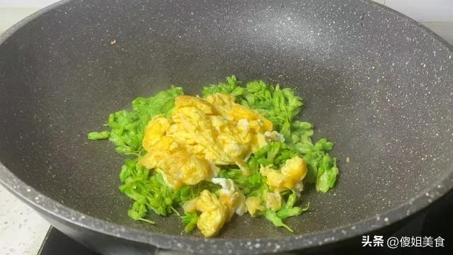 保持中火,把打好的蛋液均勻淋在夜香花上。別急着翻動,稍等片刻,看着鍋邊的蛋液開始凝固、鼓起小泡泡。這時才用鍋鏟貼着鍋底,溫柔地推動、翻轉。讓金黃的蛋液包裹着青翠的夜香花,慢慢凝結成塊。蛋液基本凝固,還帶着點溼潤光澤時,撒上少許雞精提鮮(也可不加),再翻炒幾下,讓味道融合,立刻關火出鍋!