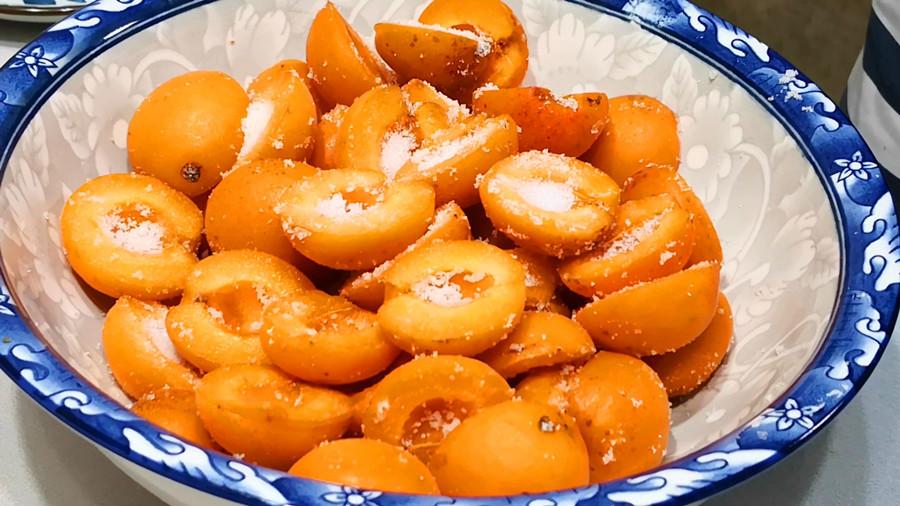 3、這一步至關重要,晾乾水分的杏子一切兩半,然後取出杏核,將去掉核的杏子肉放到乾淨無水的盆內,然後撒入適量的白砂糖,一斤杏子肉約加120克糖,然後攪拌均勻後,放到冰箱中冷藏醃製兩個小時,醃製出杏子內的杏汁。
