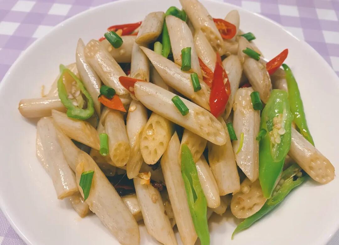 3熱鍋涼油,下入泡椒、辣椒下鍋爆香,放進藕帶,大火翻炒