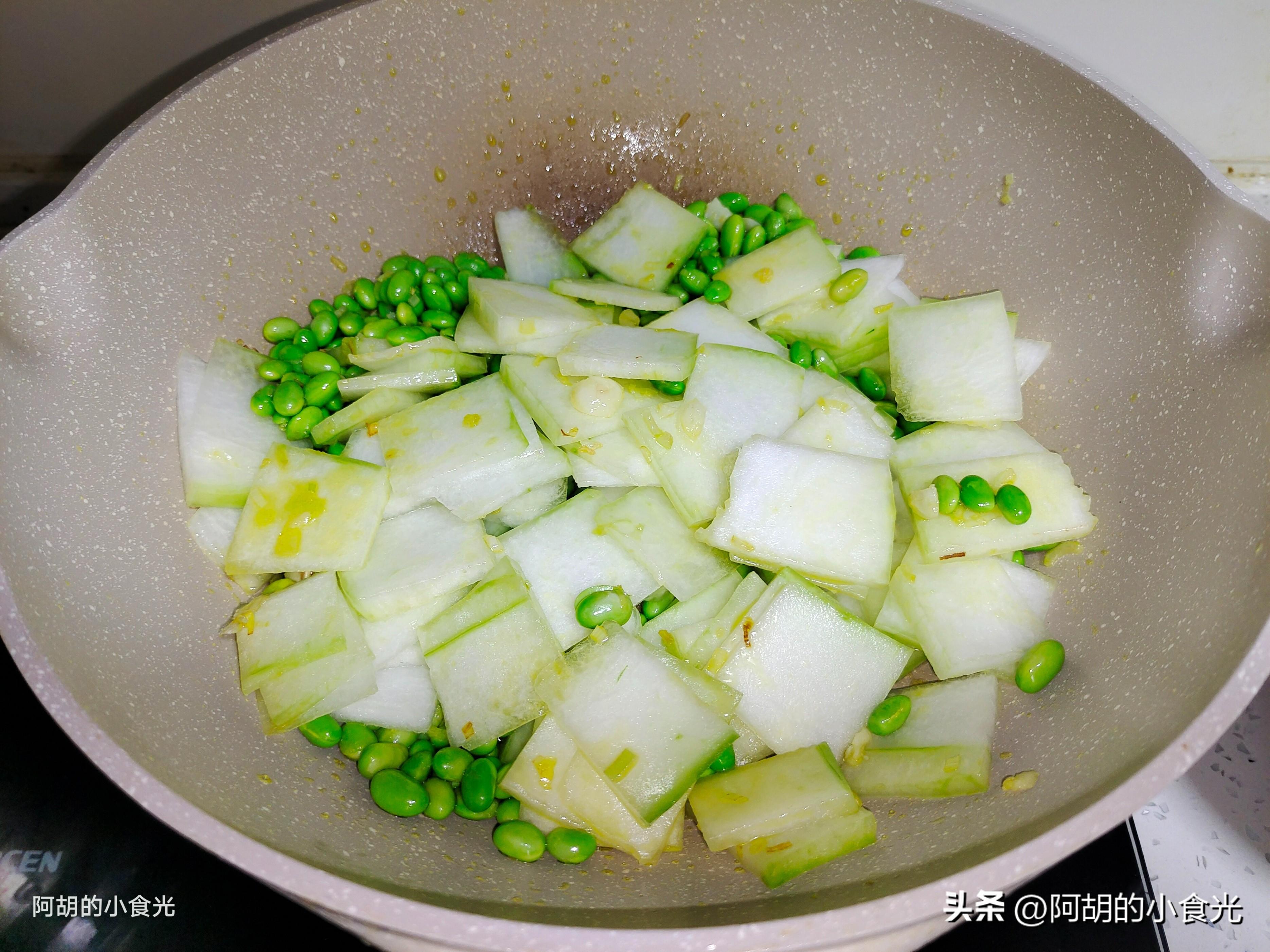 第三步:食材準備完畢後就可以點火烹飪了。先把鍋燒熱淋入一些菜籽油小火加熱,撒入一些小料蔥蒜炒出香味,接着將毛豆仁和冬瓜片一塊倒入鍋中,轉爲大火進行翻炒,炒出食材的香味。