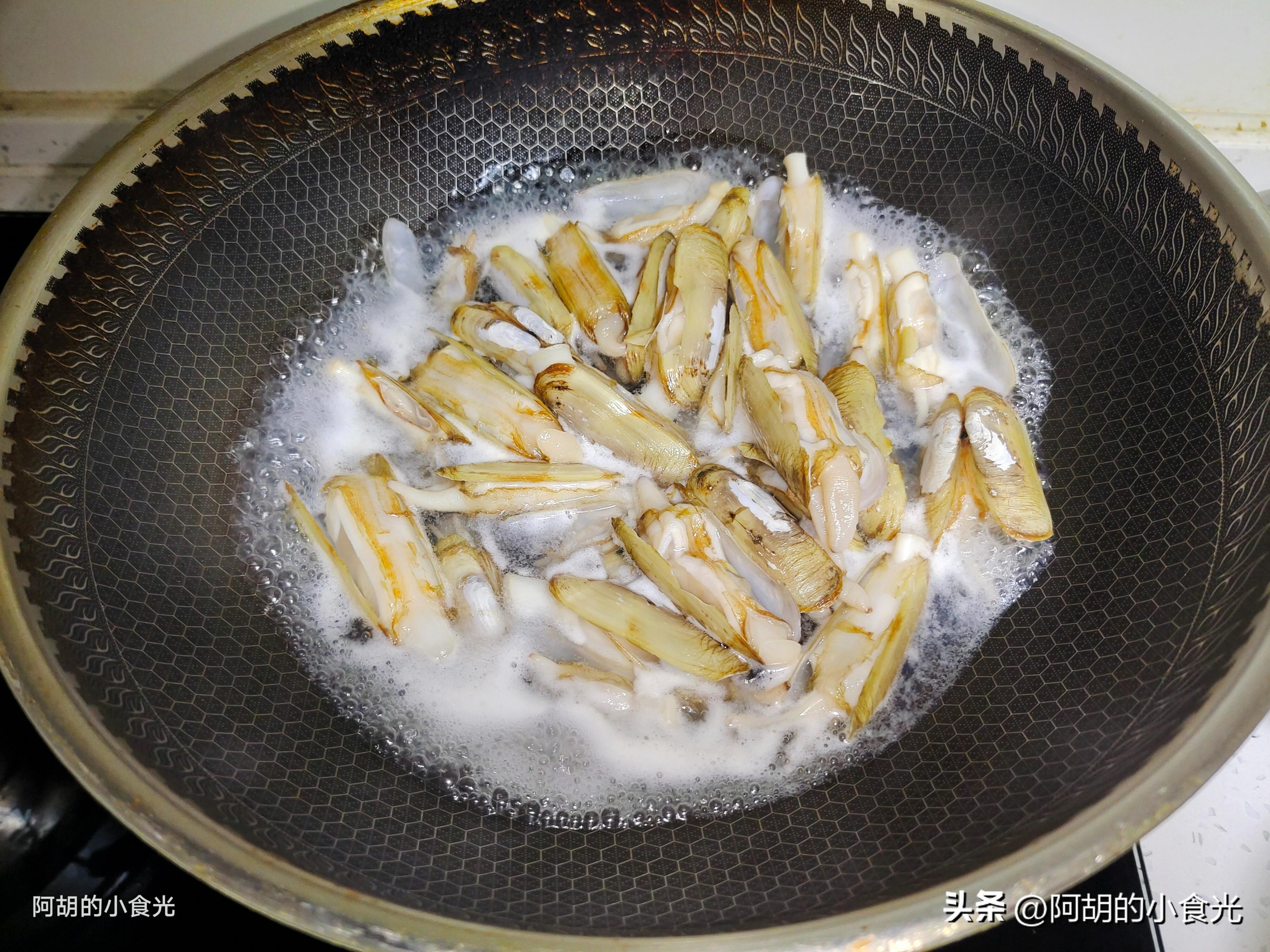 第二步:再準備500克左右的鮮活蟶子,買回家後用淡鹽水靜養一個小時左右,讓其吐一吐體內的一些泥沙。而後用流水多多地搓洗乾淨表面,直至水中無雜質的程度即可。再將蟶子倒入鍋中,添入一碗清水將其煮開至全部開殼。撈出後稍微冷卻就可以將蟶子肉取出,剩下的湯水也倒出放一邊靜置沉澱待用。