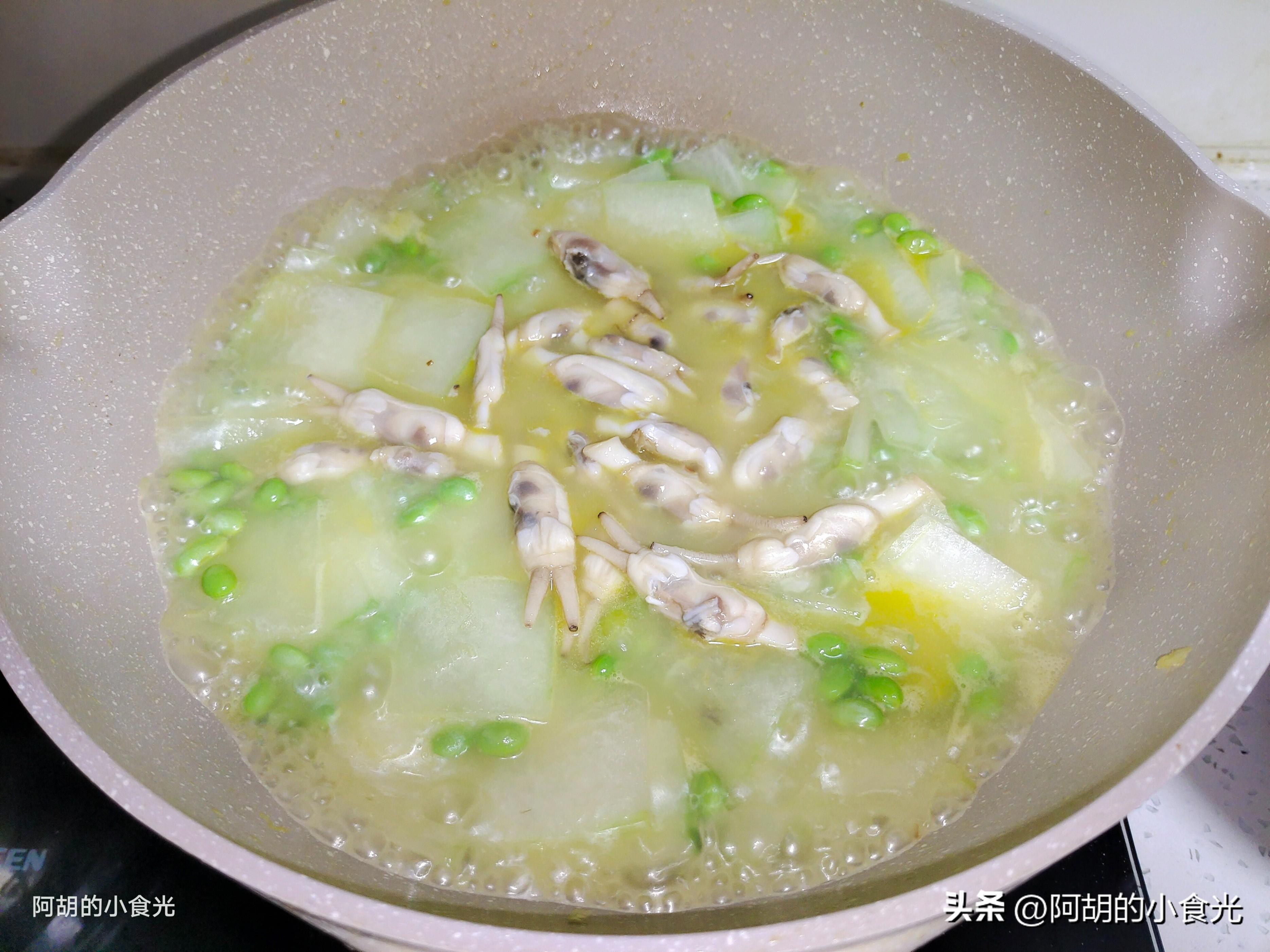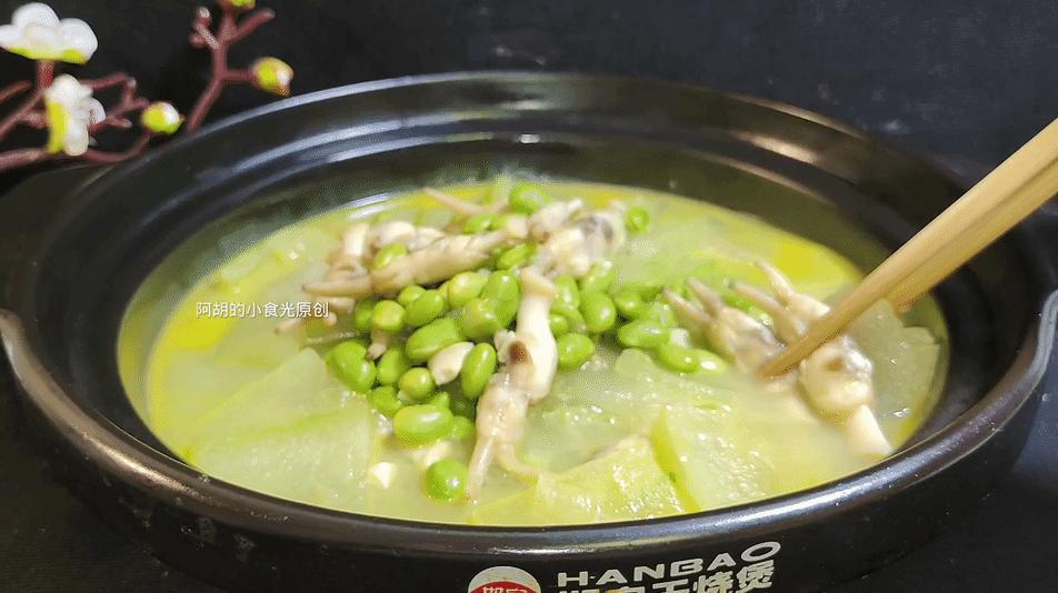 今天這道湯菜的主要食材由冬瓜+鮮毛豆+蟶肉組合而成,其中的冬瓜和毛豆都是夏季的時蔬,兩者都是解暑好菜,而且鮮毛豆自帶鮮香味,可以爲菜餚增添來自素食的鮮美之味。再搭配小海鮮蟶肉,更是鮮上鮮,成菜清爽鮮香,能喫菜更能喝湯。