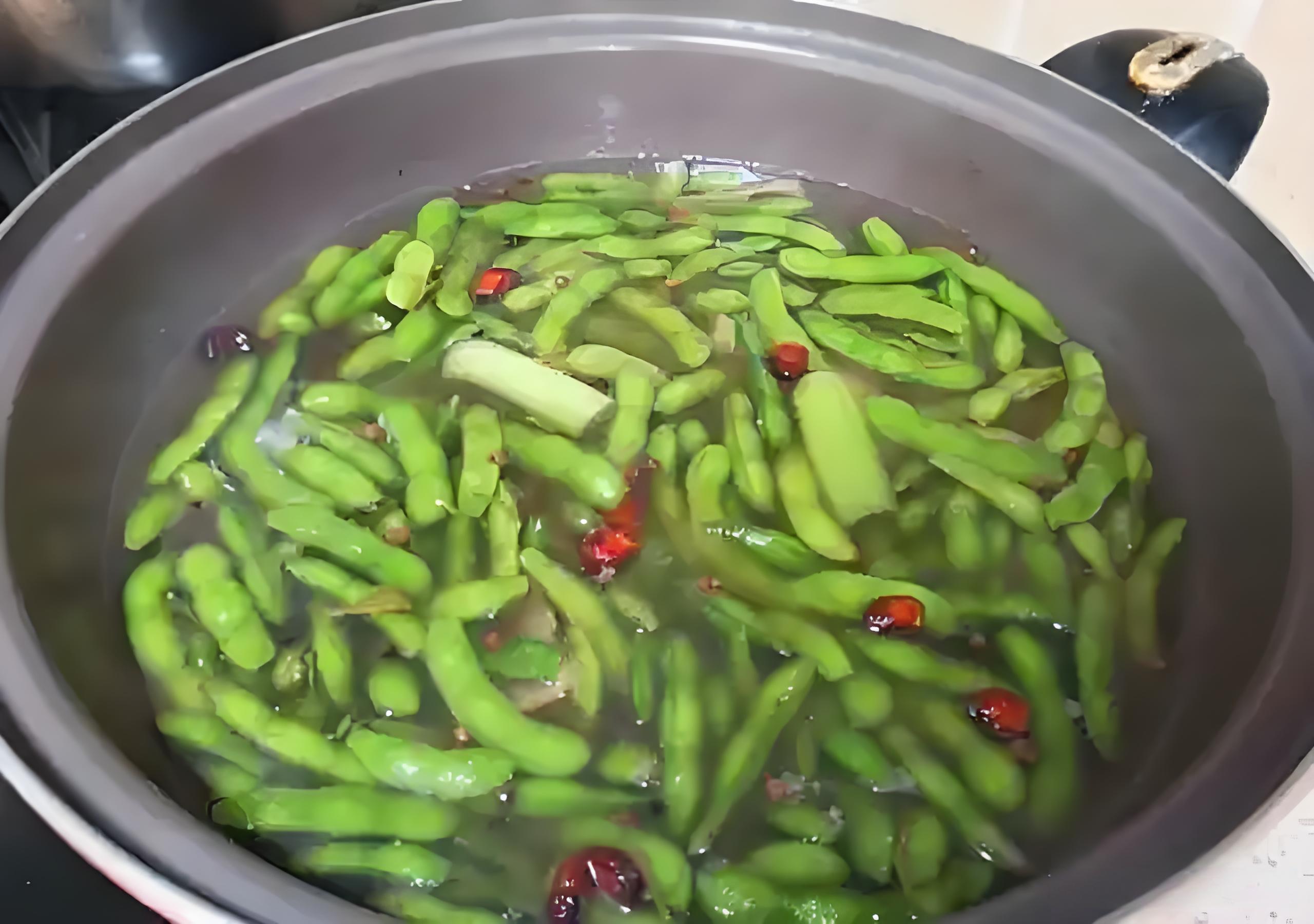 4、 最精華的一步來了——關火後,不要開蓋!不要撈出!讓毛豆繼續浸泡在熱湯中,自然冷卻。 浸泡時間至少30分鐘以上,若能浸泡1-2小時甚至更久(夏天可放涼後入冰箱冷藏浸泡),風味更佳。這漫長的“燜”的過程,正是滋味通過兩端剪開的小口,源源不斷滲透到每一顆豆粒內部的關鍵階段。時間越久,豆粒越入味,鹹鮮飽滿。