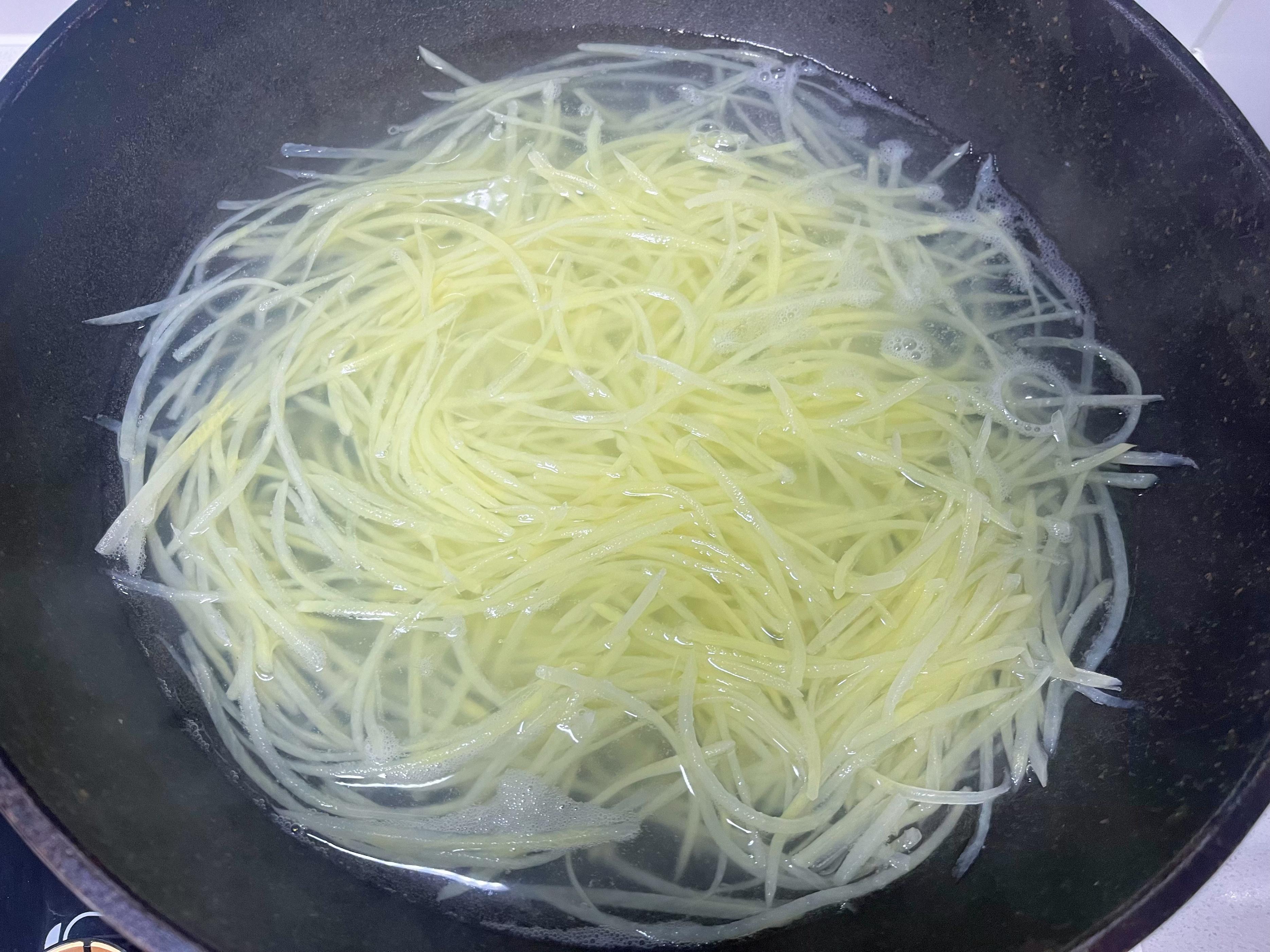 1、鍋裏多放點水,大火燒開。 水滾開後,把瀝乾的土豆絲“嘩啦”一下倒進去。別一股腦堆着,用筷子輕輕撥散開。 焯燙的時間要盯緊了!土豆絲下水後,顏色稍稍變得有點透亮(不再是死白),立刻撈出!千萬別煮過頭,大概就幾十秒到一分鐘。煮久了就軟趴趴不脆啦!