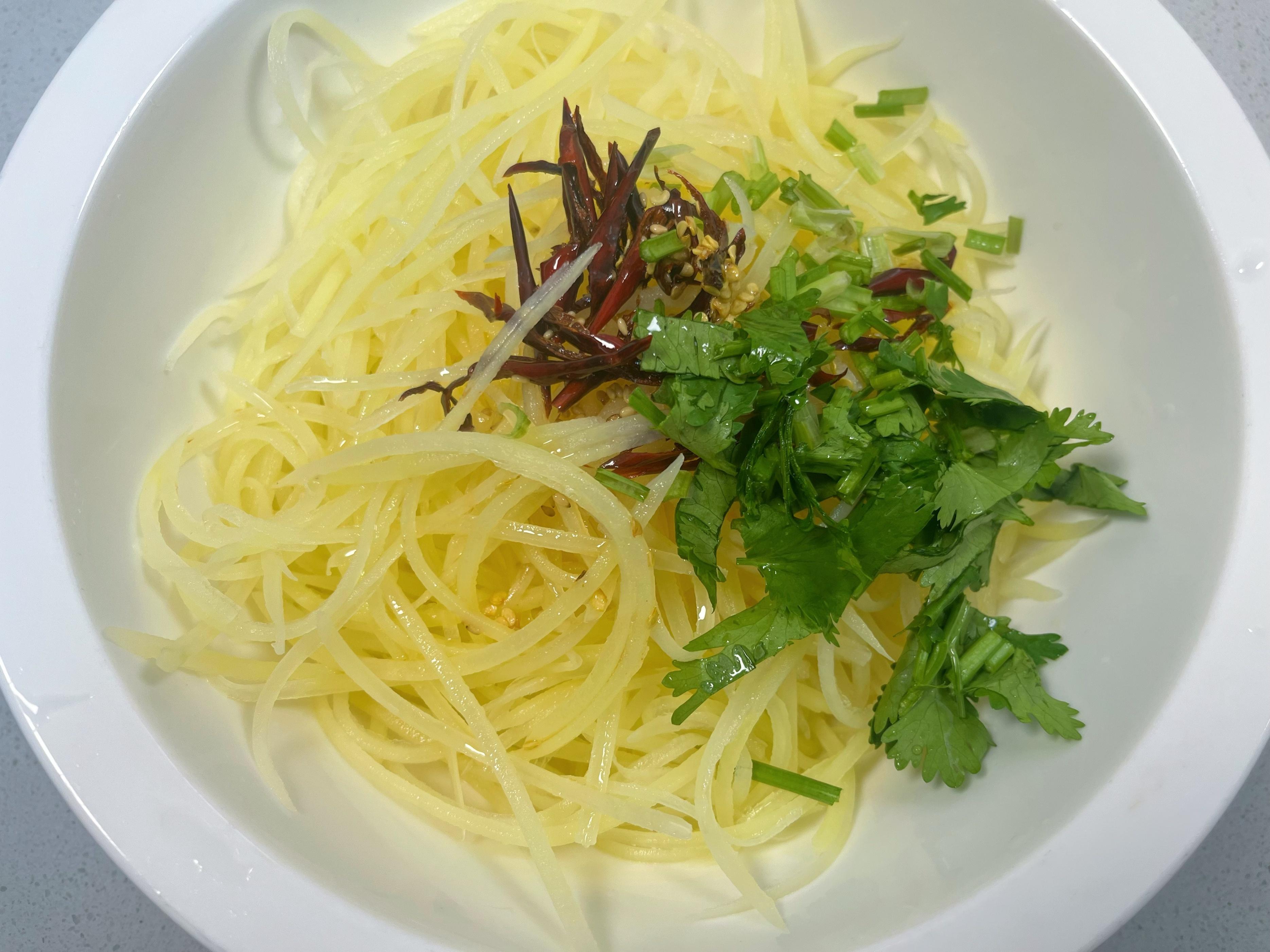 1、在攥乾的土豆絲上,放上拍碎剁細的蒜末(多來點蒜香纔夠味)、切小段的香菜(不喜歡香菜的可以不放,但放了更提味)。 接着撒上鹽(底味)、一點點白糖(提鮮,喫不出甜味)、辣椒麪或切碎的鮮小米辣(根據你家喫辣程度放)。把辣椒麪或小米辣堆在蒜末頂上。