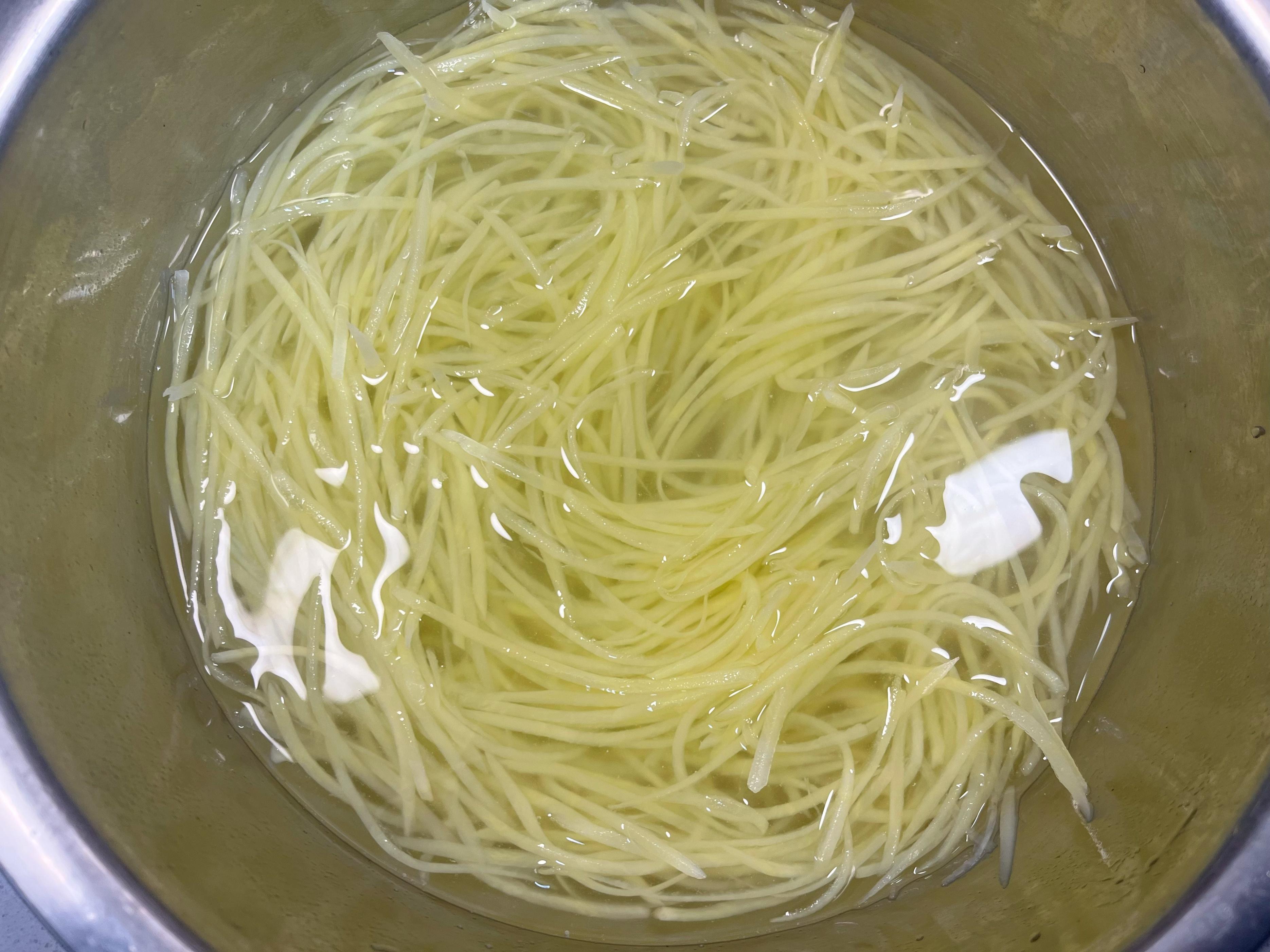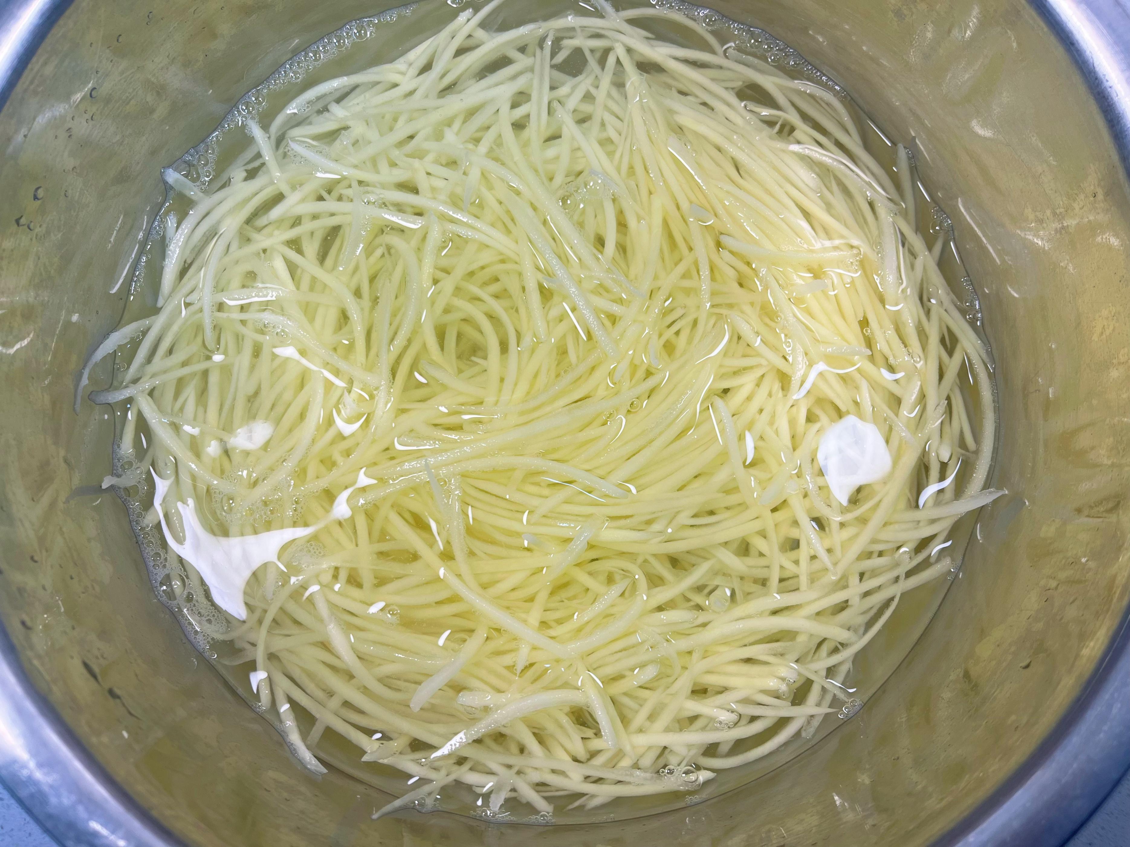 2、切好的土豆絲絕對不能直接下鍋!立馬放進一大盆清水裏,像洗衣服那樣用力搓洗幾遍,你會看到水變渾濁,這就是土豆裏的澱粉被洗出來了。倒掉渾水,再接滿清水浸泡一會兒(5-10分鐘),泡到水基本清了,土豆絲摸起來有點“筋骨”了,撈出瀝乾水分。這一步是保證土豆絲脆爽不黏糊的祕訣!
