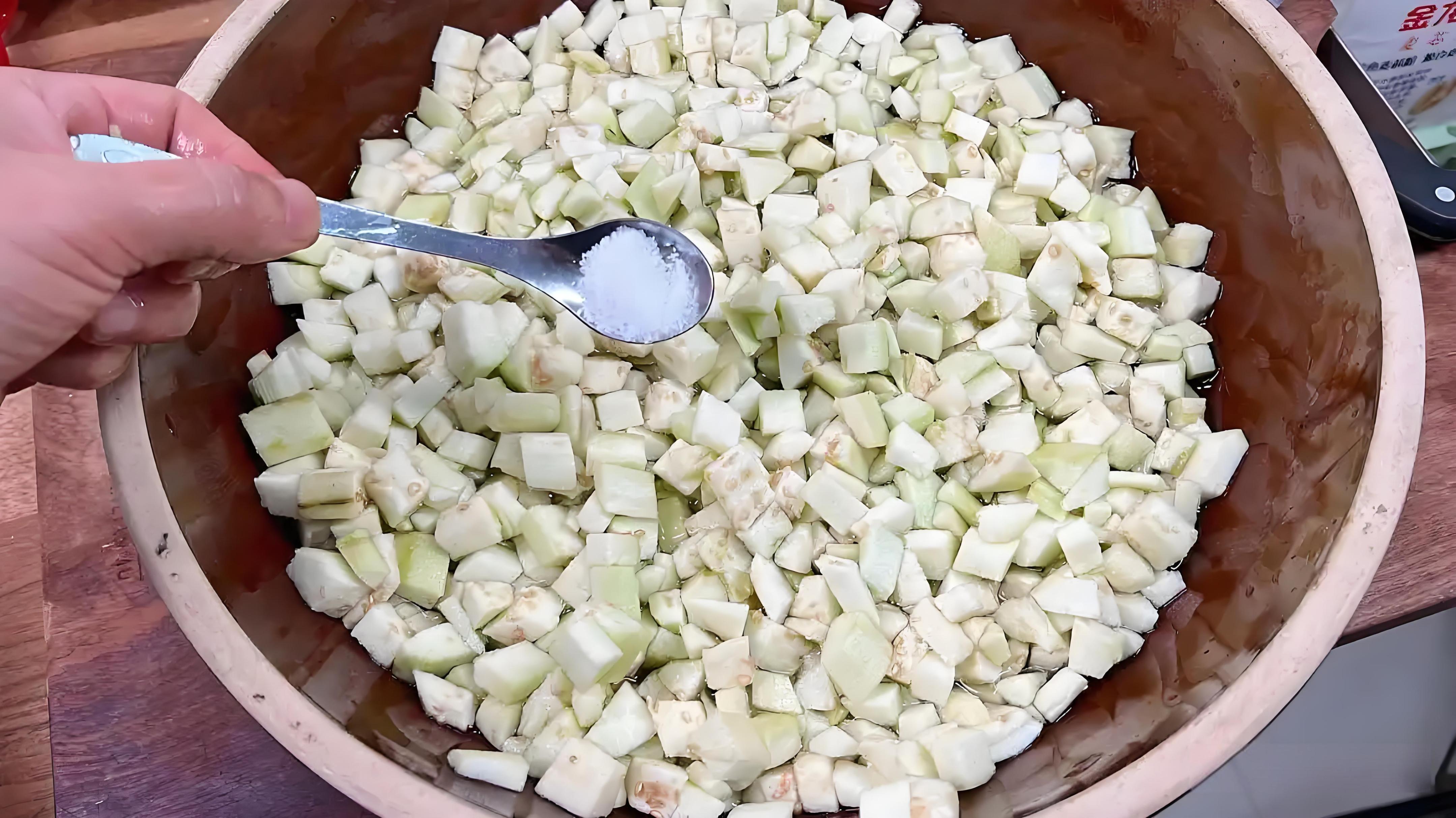 挑兩根水靈靈的長茄子,洗淨削皮(不去皮也行,看喜好),切成小丁,別太碎,留點口感。切好的茄子丁放盆裏,撒上兩小勺鹽,用手抓勻,醃上十來分鐘。鹽一撒,茄子裏的水就開始往外冒了。時間到了,找塊乾淨的紗布(或者結實的廚房紙巾也行),把醃出水的茄子丁使勁兒攥幹!這一步可別偷懶,攥得越幹,待會兒拌餡才清爽,蒸出來包子纔不會水唧唧的。攥幹後的茄子丁看着就精神多了。