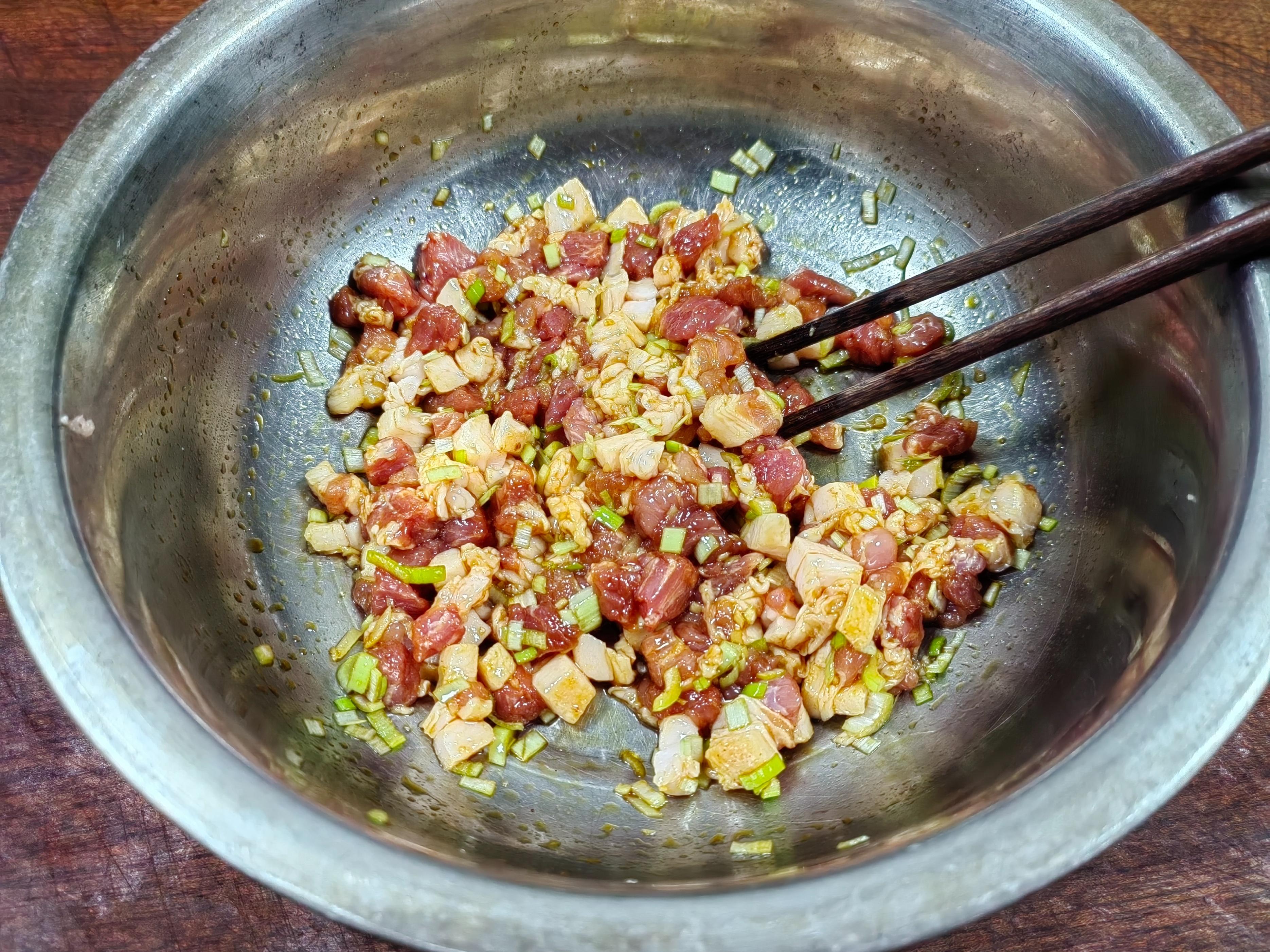 把攥得乾乾的茄子丁、捏碎的豆腐碎、還有切好的蔥花(多放點香!),一股腦兒倒進調好的肉塊碗裏。這時候,再淋上大約兩勺熟油(燒熱放涼的油,或者香油也行)。用筷子,還是朝着一個方向,把它們徹底拌勻。看,茄子丁油潤潤的,豆腐碎均勻地裹在肉餡裏,蔥花碧綠點綴着,那香味兒,拌着拌着自己就忍不住想嚐嚐了!餡兒這就調好了,放一邊讓它更入味。