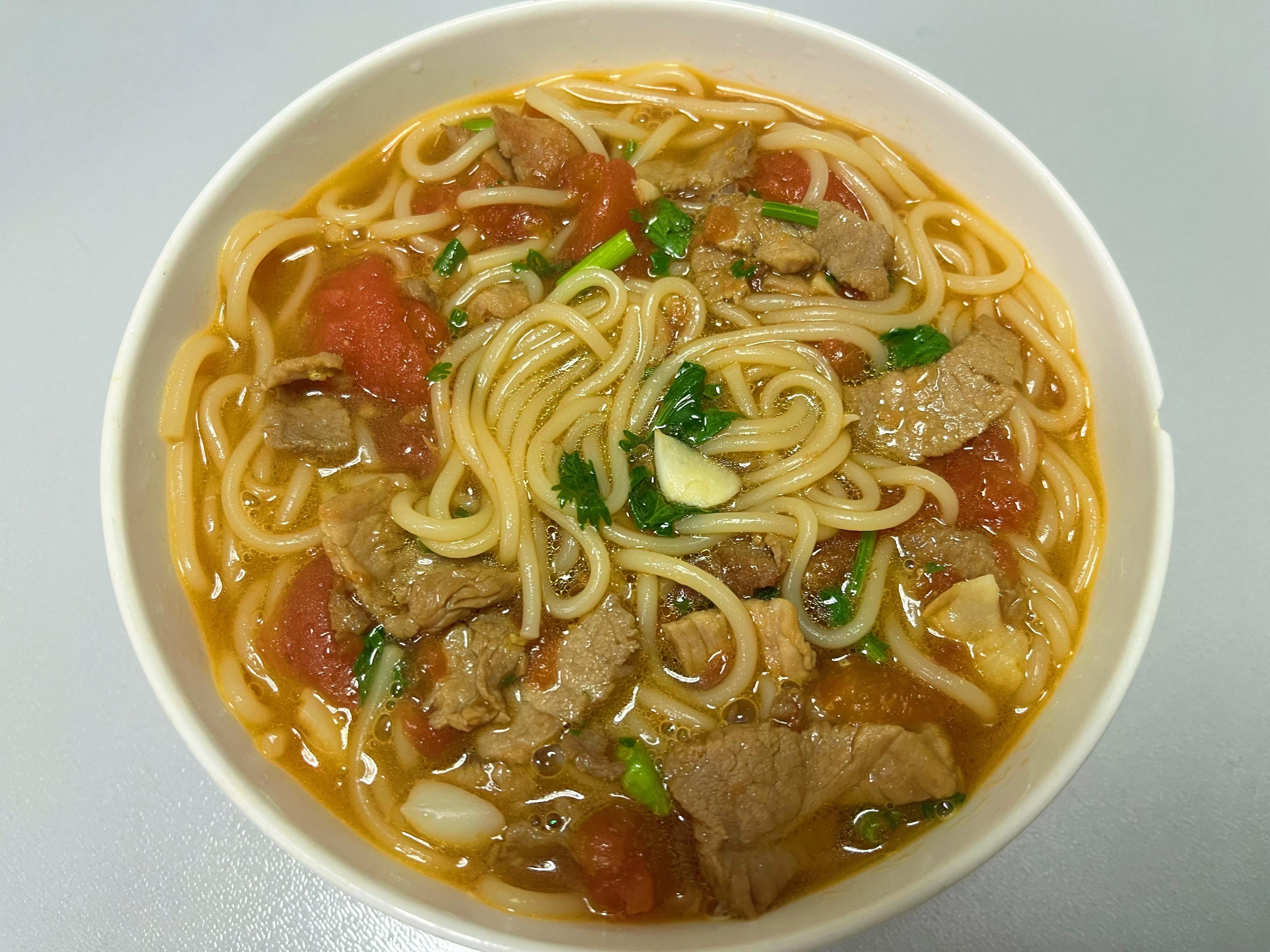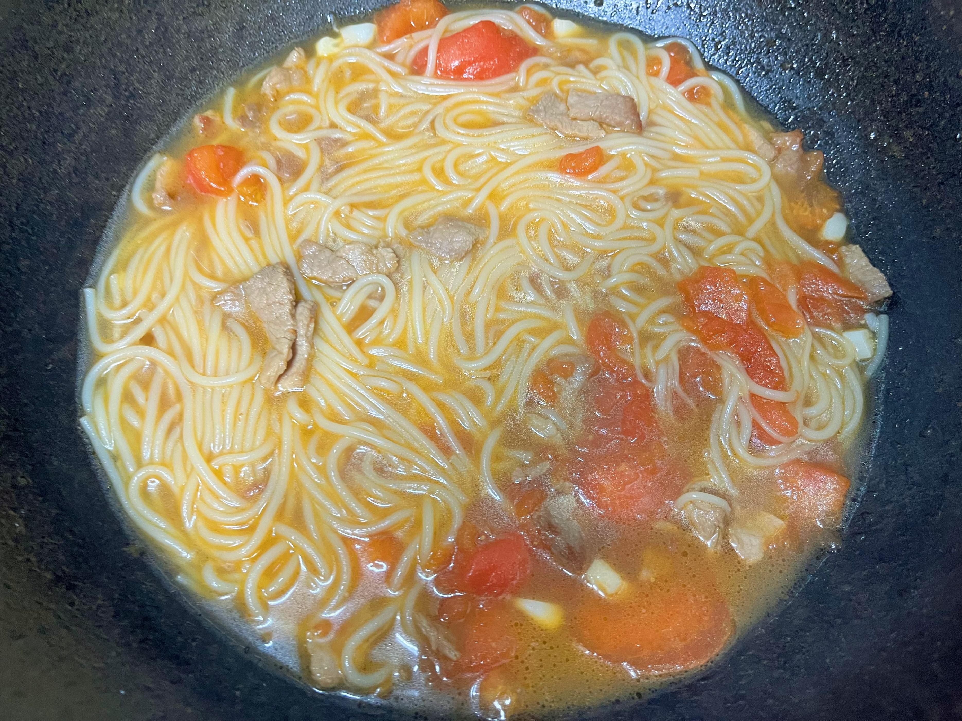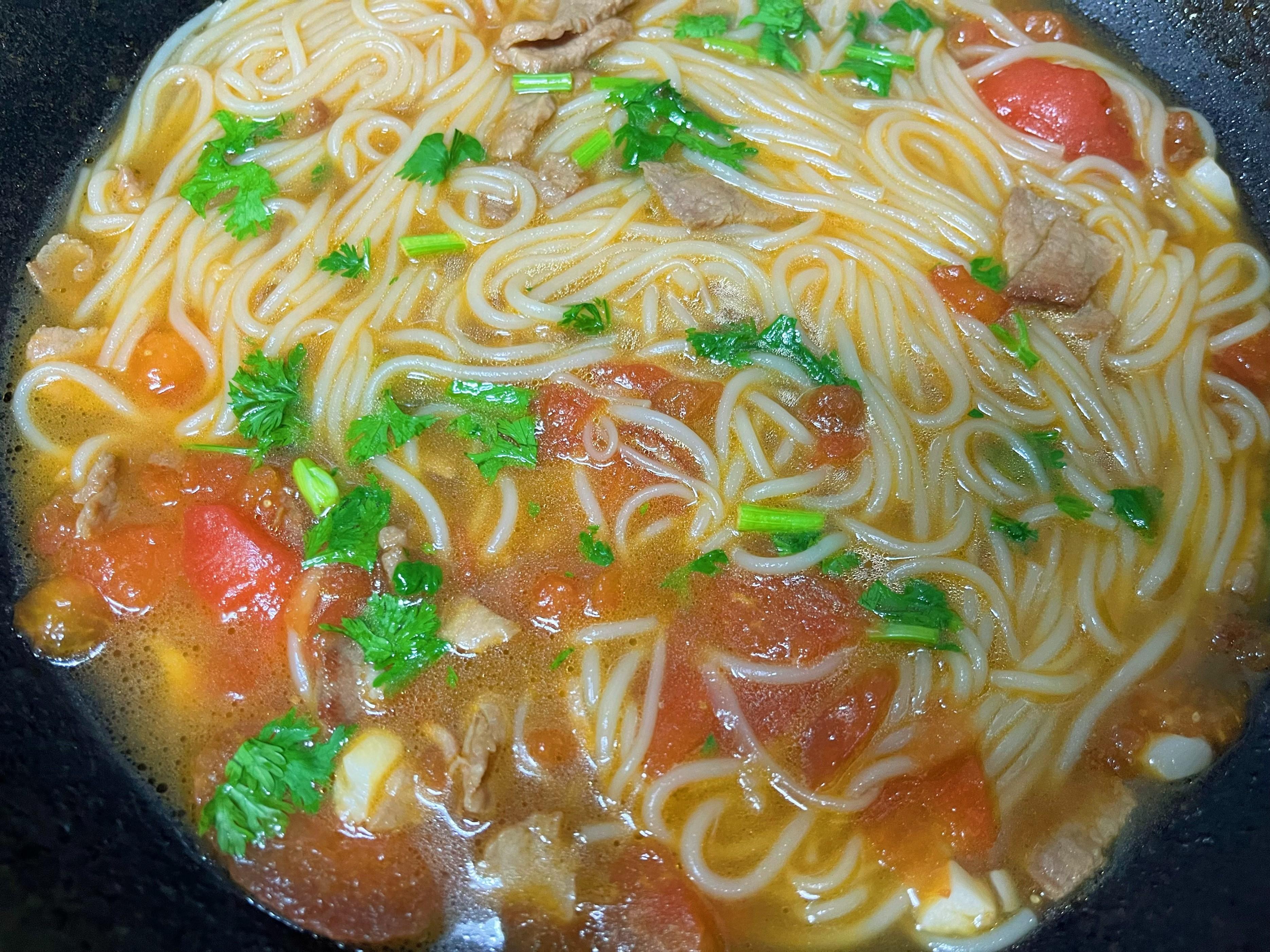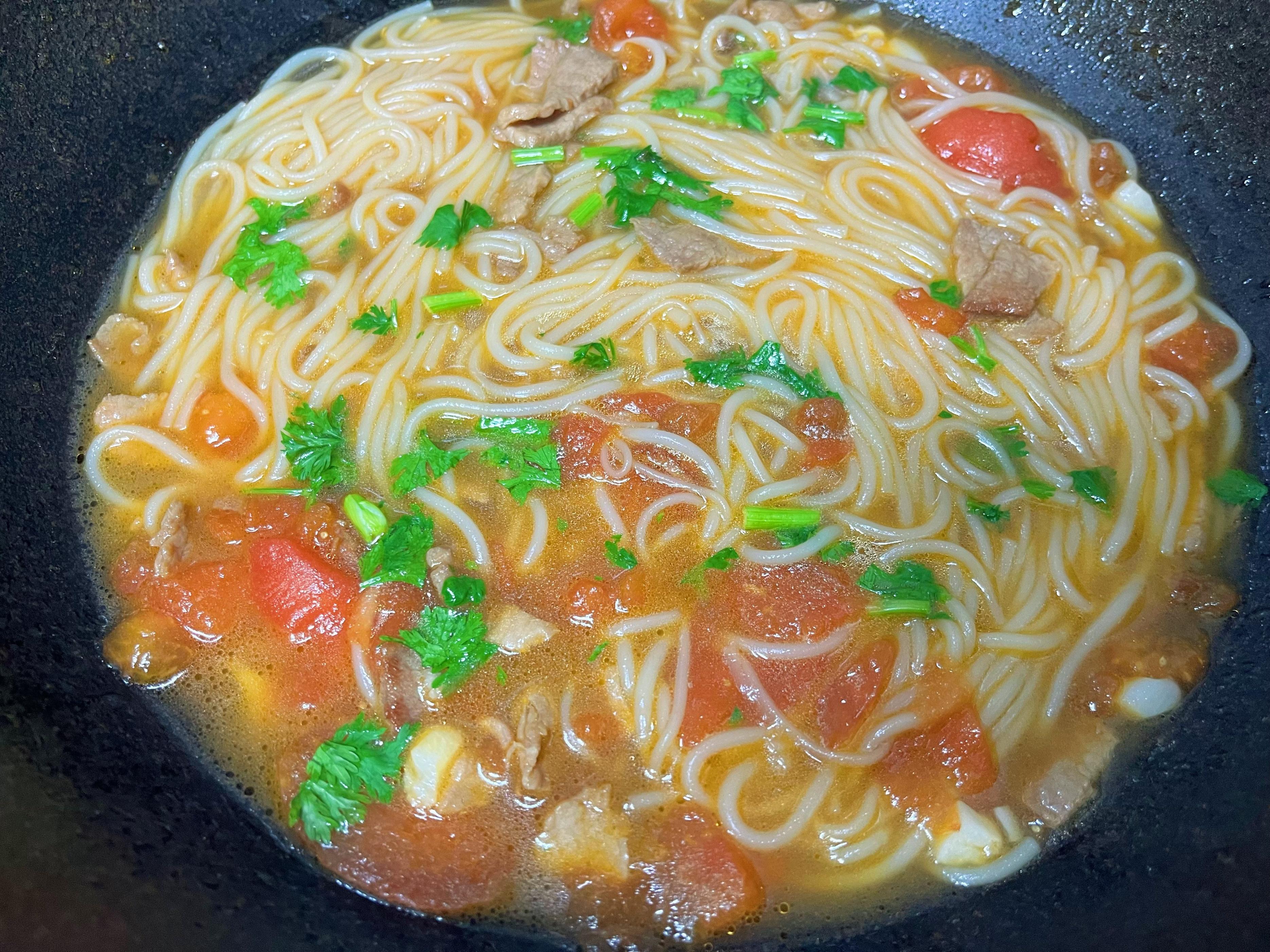 2、入湯時機:西紅柿湯底再次歡快沸騰,肉片融入其中時,把泡軟瀝乾的幹米粉(或新鮮溼米粉)輕輕放入,別猛倒濺湯。