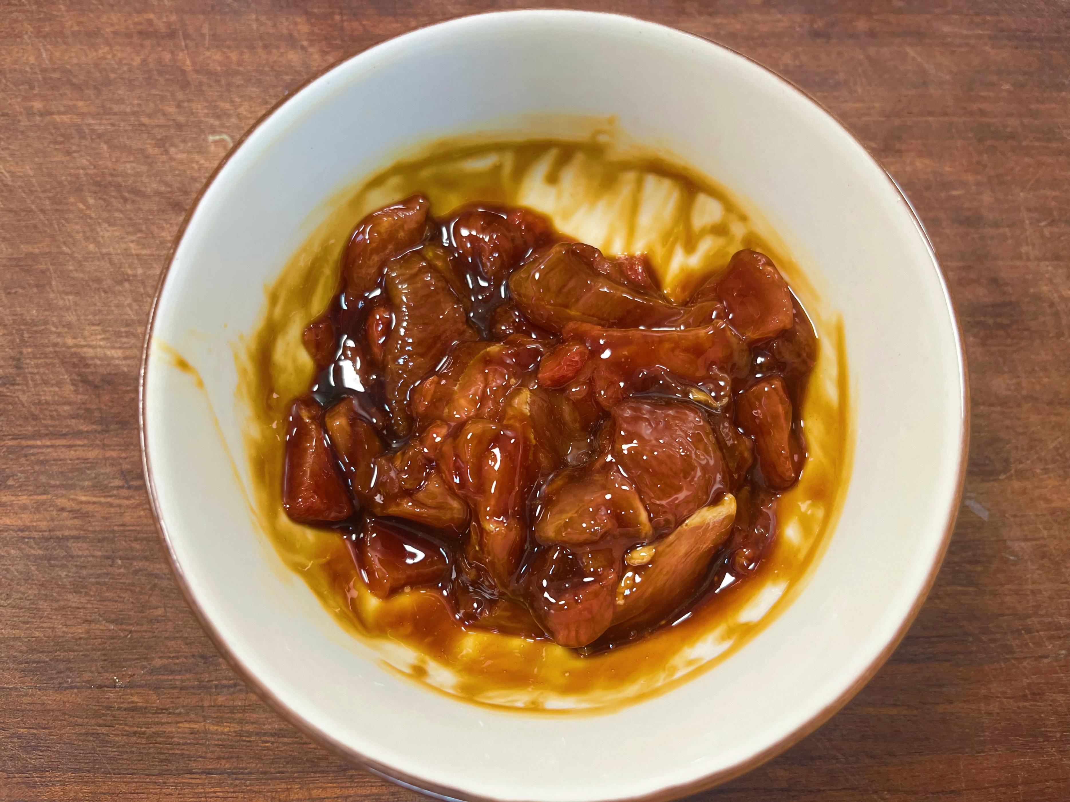 - 鎖水穿“雨衣”:上手輕輕抓揉,讓料汁均勻裹好,感覺有點粘手就對了。最後淋一點食用油,拌一拌。這層油像給小肉片穿了滑溜溜的“小雨衣”,鎖住水分,等下鍋炒時利利索索不粘連,絕不變成“老疙瘩”。